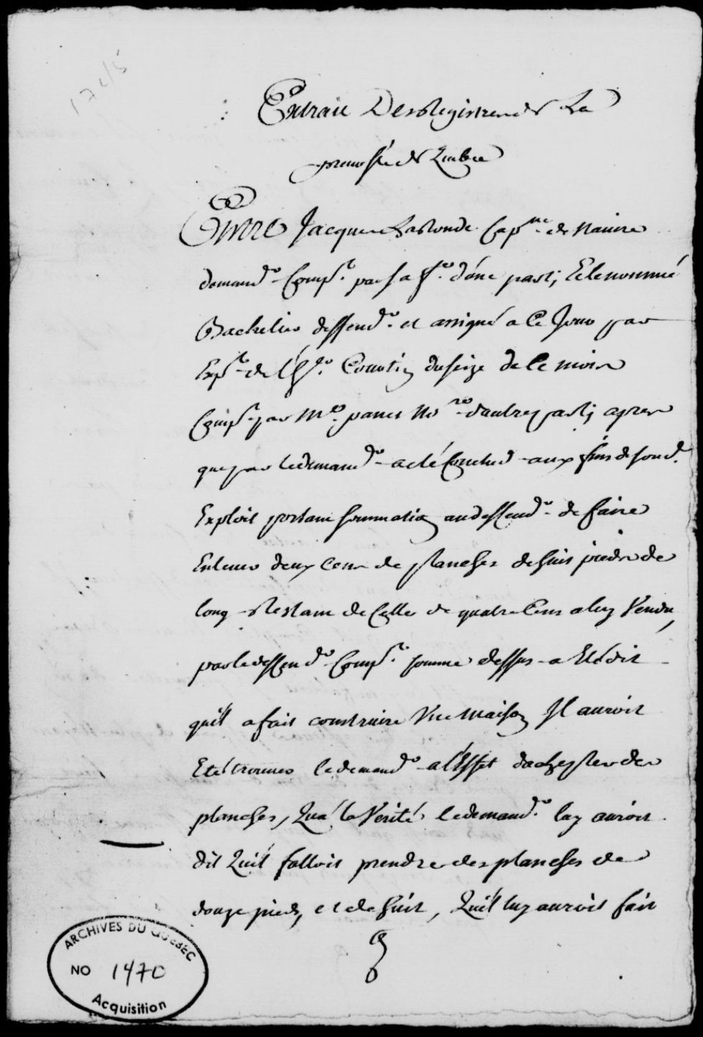 Sentence rendue dans le procès entre Jacques Laronde, capitaine de navire, domicilié rue De Meulles à Québec, et le nommé Bachelier, maître de billard, comparant par maître Panet, notaire, au sujet d'une réclamation de planches, à l'effet que le défendeur devra comparaître en personne, suivie d'un exploit de signification de ladite sentence et d'une assignation dudit Bachelier à comparaître, 22 juin 1745 - 26 juin 1745, Archives nationales à Québec, Fonds Prévôté de Québec, (03Q,TL1,S11,SS2,D1470).