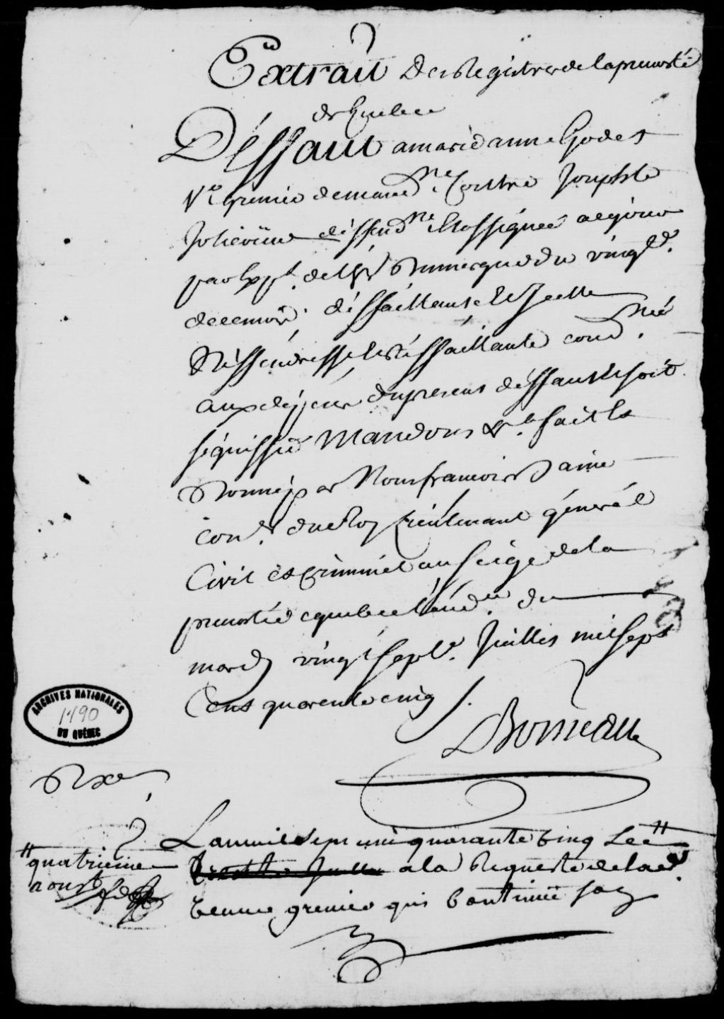 Défaut accordé à Marie-Anne Godet (Gaudet), veuve du sieur Grenier, domiciliée rue du Sault-au-Matelot à Québec, contre Josephte (Josèphe) Jolicoeur, demeurant rue Champlain à Québec, assignée, défaillante et condamnée aux dépens dudit défaut, suivi d'un exploit de signification du défaut et d'assignation à ladite Jolicoeur, 27 juillet 1745 - 4 août 1745, Archives nationales à Québec, Fonds Prévôté de Québec, (03Q,TL1,S11,SS2,D1490).