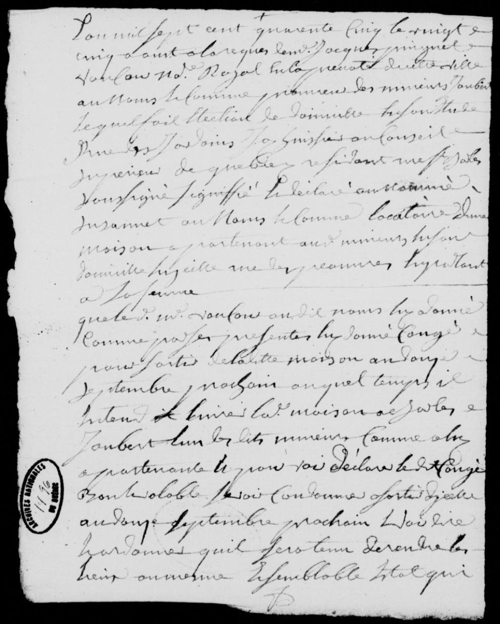À la requête de Jacques Pinguet, sieur de Vaucourt (Vaucours), notaire royal en la Prévôté de Québec, au nom et comme procureur des enfants mineurs Joubert, domicilié rue des Jardins à Québec, congé signifié au nommé Susannet (Souzanet), locataire d'une maison, propriété desdits mineurs, lequel est prié d'en sortir pour le 12 septembre afin que Charles Joubert, l'un desdits mineurs, puisse l'occuper, et assignation à lui donnée de comparaître