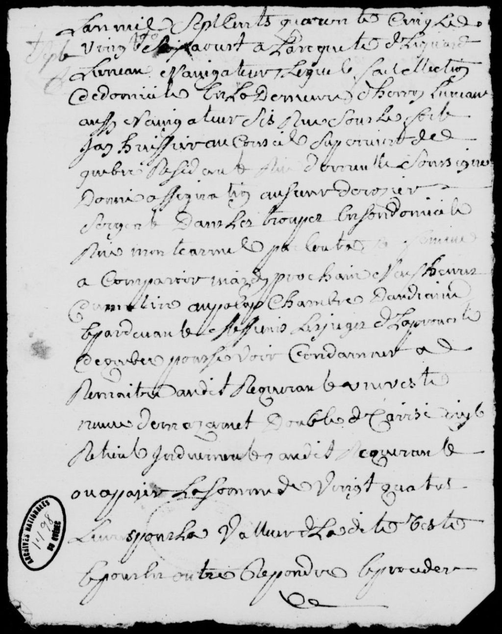 À la requête du sieur Luneau (Louineau, Luineau), navigateur, demeurant rue Sous-le-Fort à Québec, assignation du sieur Desrosiers, sergent dans les troupes de la marine, domicilié rue Mont-Carmel à Québec, afin qu'il remette au requérant une veste neuve qu'il retient indûment, ou qu'il paie 24 livres pour la valeur de ladite veste, 26 août 1745, Archives nationales à Québec, Fonds Prévôté de Québec, (03Q,TL1,S11,SS2,D1498).