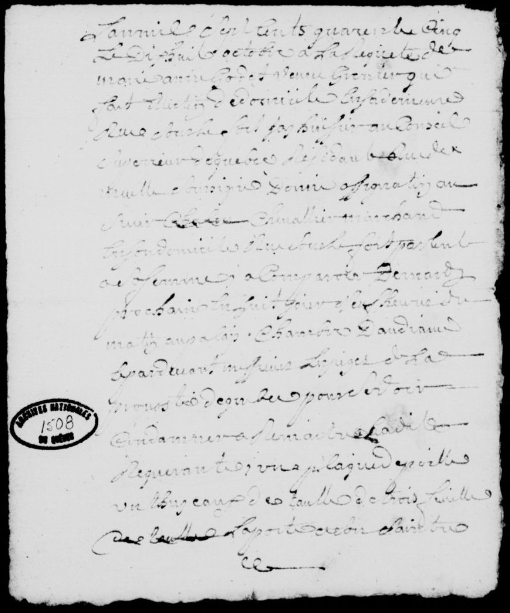 À la requête de Marie-Anne Godet (Gaudet), veuve du sieur Grenier, domiciliée rue Sous-le-Fort à Québec, assignation du sieur Chevalier, marchand, également domicilié sur ladite rue, afin qu'il remette à la requérante une plaque de poêle, un tuyau de tôle de trois feuilles et une porte, avec dépens, 18 octobre 1745, Archives nationales à Québec, Fonds Prévôté de Québec, (03Q,TL1,S11,SS2,D1508).
