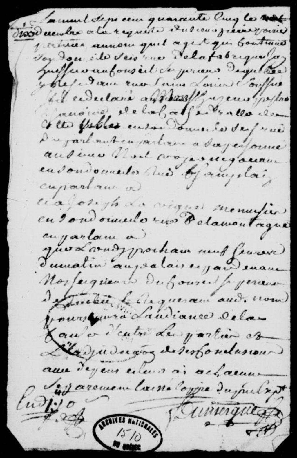 À la requête du sieur Pierre Poirier, praticien, demeurant sur la rue de la Fabrique à Québec, déclaration faite à monsieur Hazeur, chanoine de la cathédrale de Québec, domicilié rue du Parloir, à Noël Voyer, négociant demeurant sur la rue Champlain, et à Joseph Lavigne, menuisier de Québec, domicilié rue de la Montagne, à l'effet que le requérant poursuivra l'audience de la cause et l'adjudication de ses conclusions, 10 décembre 1745, Archives nationales à Québec, Fonds Prévôté de Québec, (03Q,TL1,S11,SS2,D1510).