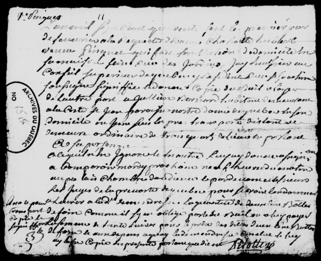 Bail à loyer d'une petite prairie sise au pied du coteau Sainte-Geneviève, consenti par Charlotte Hubert, veuve du sieur Pinguet, demeurant rue des Jardins à Québec, à Julien Bernard, demeurant dans la côte Saint-Jean, dans la paroisse de Notre-Dame-de-Québec, en échange d'une quantité de foin, exploit de signification dudit bail au sieur Bernard, et assignation à lui donnée afin qu'il livre le foin en question ou paie la somme de 30 livres, 17 avril 1746 - 1er février 1747, Archives nationales à Québec, Fonds Prévôté de Québec, (03Q,TL1,S11,SS2,D1518).
