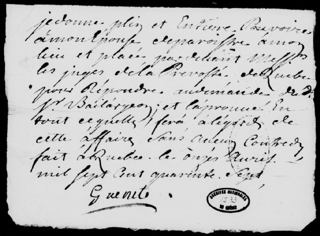 Procuration du sieur Guénet à sa femme pour répondre aux demandes du sieur Baillargeon devant les juges de la Prévôté de Québec, 11 avril 1747, Archives nationales à Québec, Fonds Prévôté de Québec, (03Q,TL1,S11,SS2,D1573).