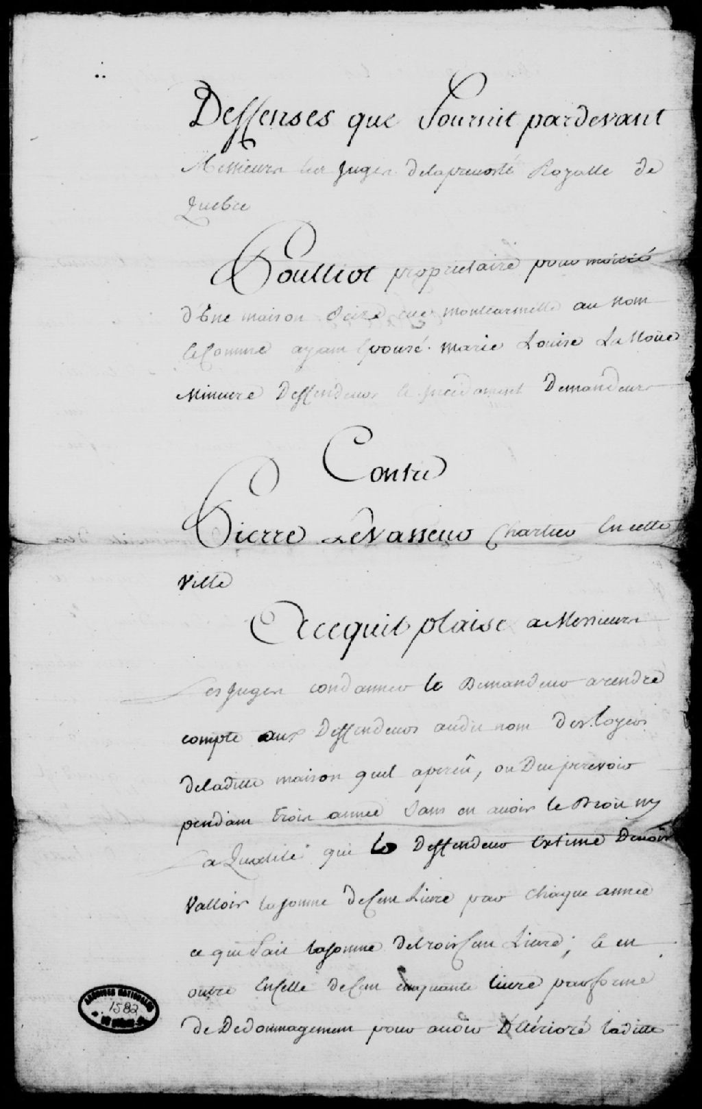 Écrit de défense que fournit le sieur Pouliot, propriétaire de la moitié d'une maison sise rue Mont-Carmel à Québec, au nom et comme ayant épousé Marie-Louise Lanoue, mineure, contre Pierre Levasseur, charretier de Québec, par lequel ledit Pouliot réclame que le sieur Levasseur rende compte des loyers de ladite maison qu'il a perçus, sans en avoir le droit, 18 avril 1747, Archives nationales à Québec, Fonds Prévôté de Québec, (03Q,TL1,S11,SS2,D1582).