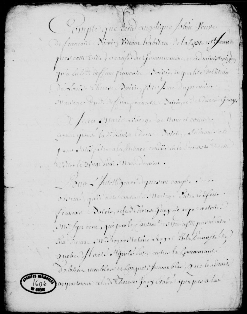 - Compte que rend Angélique Jobin, veuve de François Boivin, tuteur de Louise-Thérèse Boivin, sa fille issue de son premier mariage avec Thérèse Guay, à Jean-Marie Liberge, époux de la dite Louise-Thérèse Boivin, pour satisfaire à la sentence de la Prévôté de Québec du 28 mars, et signification dudit compte au sieur Liberge et à sa femme, à la requête d'Angélique Jobin, afin de permettre d'éventuels débats, en leur offrant de communiquer les pièces justificatives