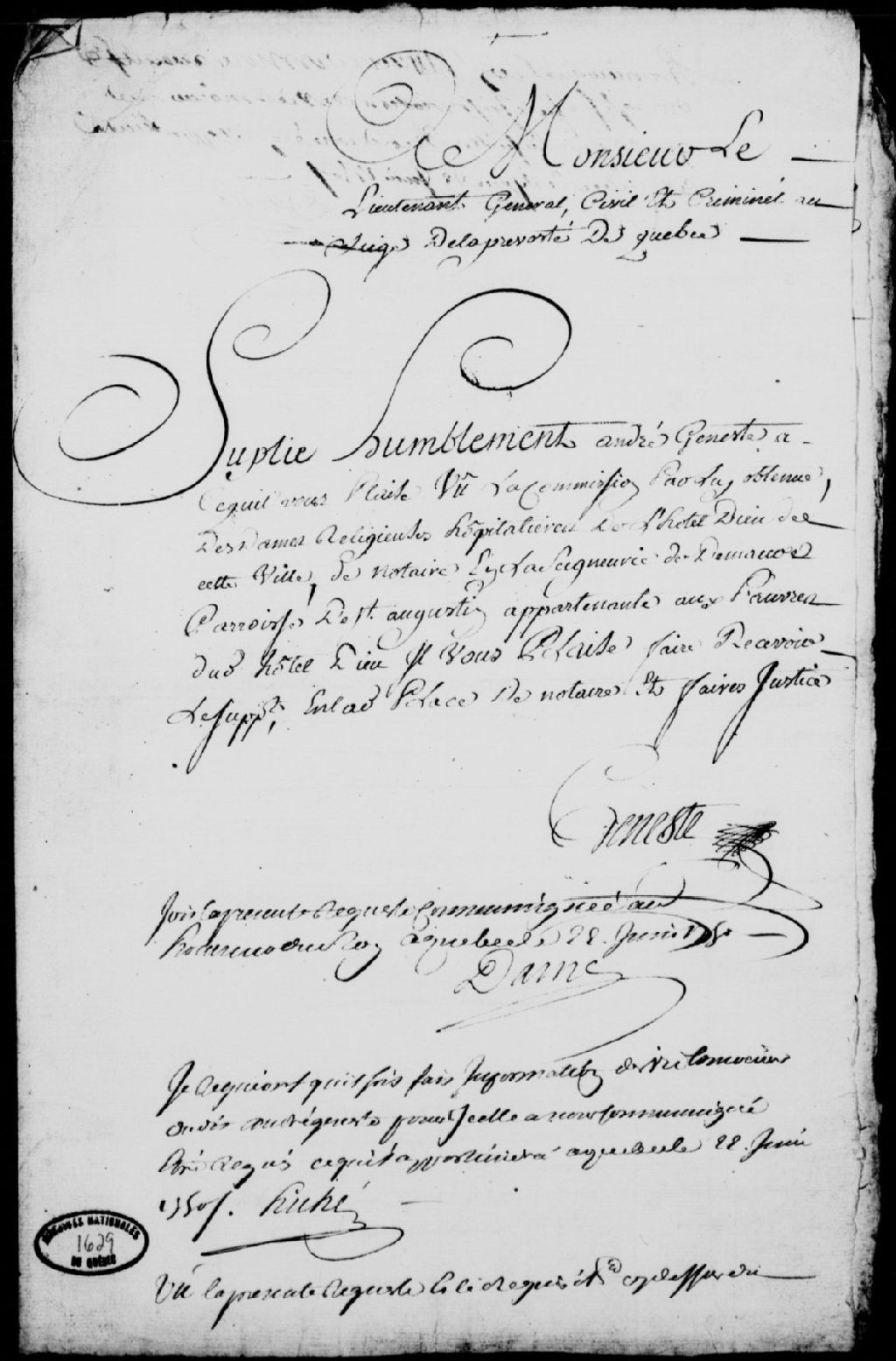 Enquête de vie et moeurs faite sur André Genest, lequel a obtenu des Dames Religieuses Hospitalières de l'Hôtel-Dieu de Québec la commission de notaire de la seigneurie de Demaure (Maure), paroisse de Saint-Augustin, appartenant aux Pauvres dudit Hôtel-Dieu de Québec, 22 juin 1750 - 23 juin 1750, Archives nationales à Québec, Fonds Prévôté de Québec, (03Q,TL1,S11,SS2,D1629).