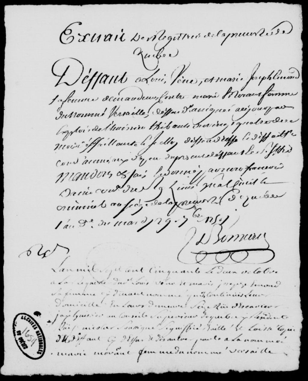 Défaut accordé à Louis Venne et à sa femme, Marie-Josèphe Émond, domiciliés rue des Carrières à Québec, contre Marie Morand, femme du sieur Versailles, perruquier de Québec, assignée le 24 septembre, défaillante et condamnée aux dépens dudit défaut, suivi d'un exploit de signification du défaut et d'une assignation donnés à ladite Marie Morand, 29 septembre 1750 - 2 octobre 1750, Archives nationales à Québec, Fonds Prévôté de Québec, (03Q,TL1,S11,SS2,D1654).
