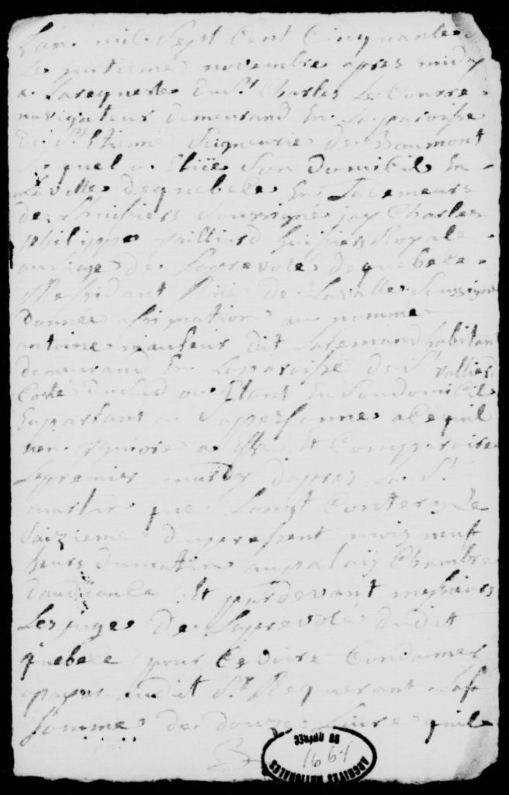 À la requête de Charles Lecours, navigateur, demeurant dans la paroisse de Saint-Étienne, dans la seigneurie de Beaumont, assignation d'Antoine Molleur (Moleur) dit Lallemand, habitant demeurant dans la paroisse de Saint-Vallier, afin qu'il paie au requérant les 12 livres qu'il lui doit depuis deux ans pour des fournitures et de l'argent prêté, déclaration audit Lallemand pour lui faire savoir que l'assignation sera continuée, et procuration dudit Lecours à l'huissier Charles-Philippe Jailliard, domicilié rue Laval à Québec, pour paraître à l'audience du 7 décembre à sa place, étant donné qu'il est malade, 8 novembre 1750 - 2 décembre 1750, Archives nationales à Québec, Fonds Prévôté de Québec, (03Q,TL1,S11,SS2,D1664).