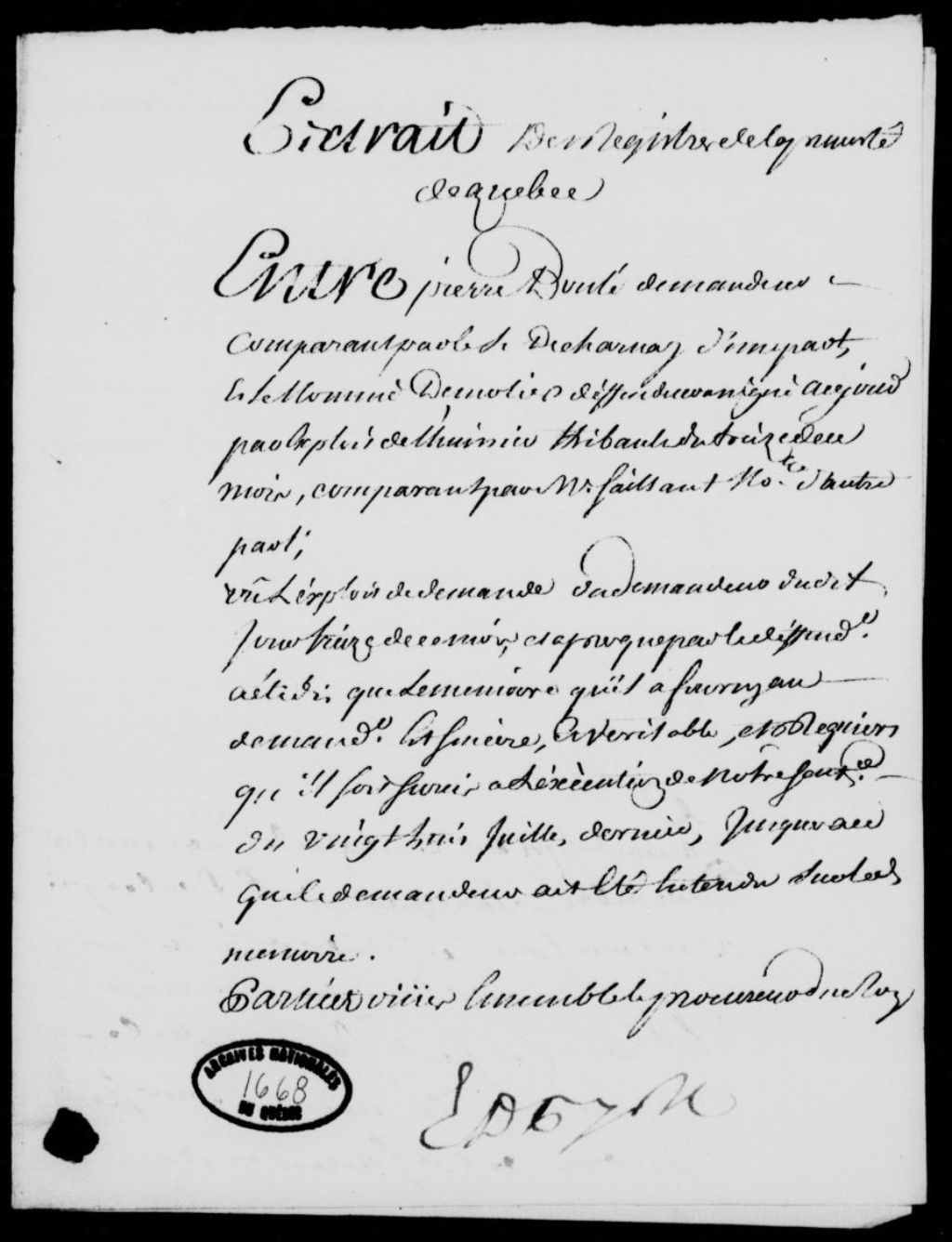 Sentence rendue dans le procès entre Pierre Boulay (Boulet, Boulé) et le nommé Desmoliers, à l'effet que le demandeur comparaîtra en personne dans quinzaine pour être entendu, et jusque là, il y a sursis à l'exécution de la sentence, et signification de ladite sentence aux sieurs Desmoliers et Saillant, suivant la requête du sieur Boulay, et assignation donnée audit Desmoliers de comparaître, 17 novembre 1750 - 24 décembre 1750, Archives nationales à Québec, Fonds Prévôté de Québec, (03Q,TL1,S11,SS2,D1668).