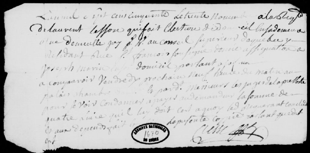 À la requête de Laurent Tesson, domicilié rue De Meulles à Québec, assignation de Joseph Morin, demeurant à Québec, afin qu'il paie au requérant les 4 livres qu'il lui doit, avec dépens, 30 novembre 1750, Archives nationales à Québec, Fonds Prévôté de Québec, (03Q,TL1,S11,SS2,D1670).