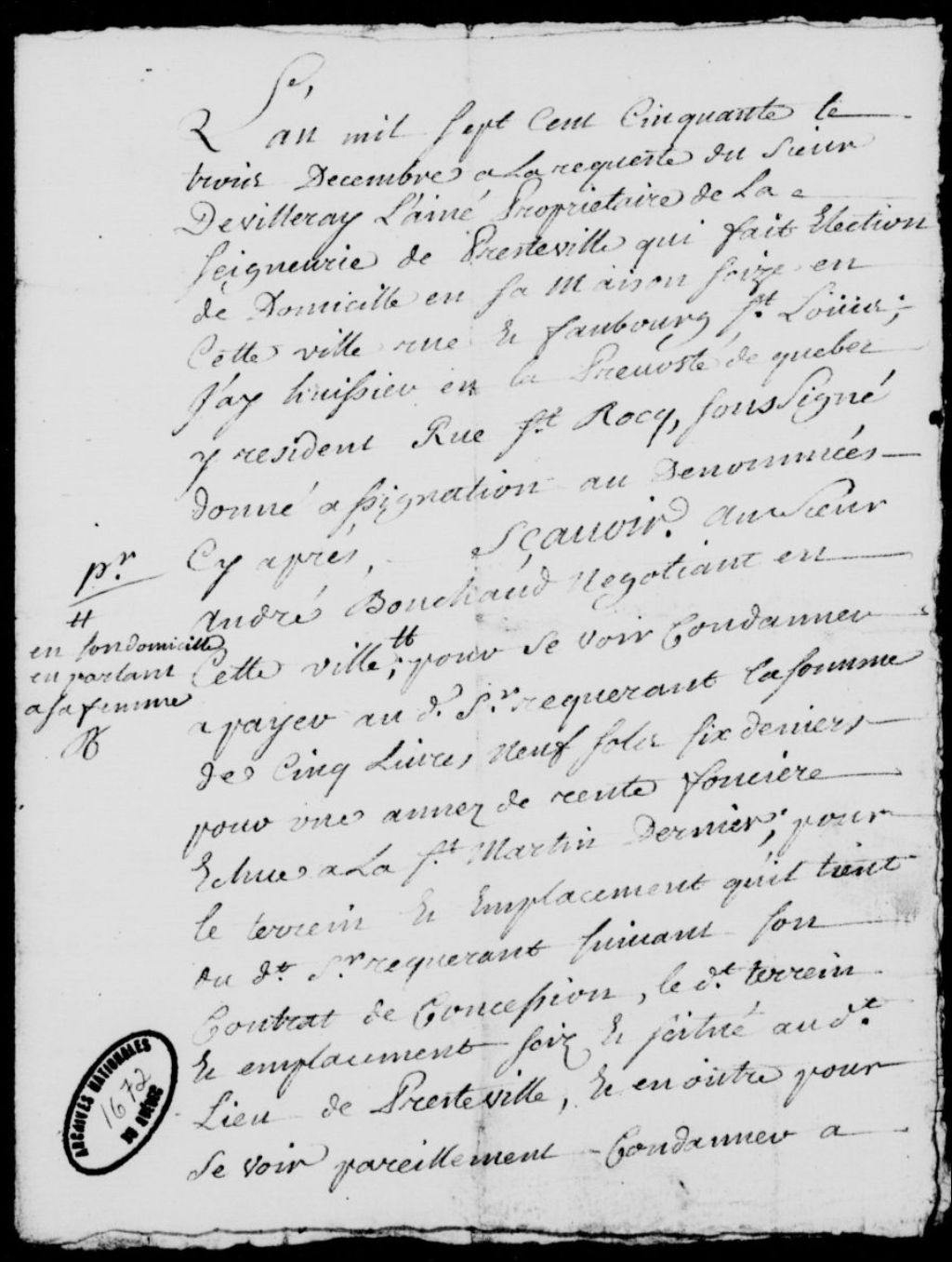 À la requête de monsieur de Villeray l'aîné, propriétaire de la seigneurie de Presteville, demeurant rue Saint-Louis à Québec, assignation donnée à André Bouchard, négociant de Québec, à Laurent Tesson, demeurant rue De Meulles à Québec, au nommé Tranquille, à Jean Derome, et au nommé Villeneuve, afin que tous paient pour les rentes dues pour les terrains et emplacements qu'ils tiennent du requérant dans ladite seigneurie de Presteville, et pour qu'ils apportent une copie de leurs contrats de concession à leurs frais, 3 décembre 1750, Archives nationales à Québec, Fonds Prévôté de Québec, (03Q,TL1,S11,SS2,D1672).