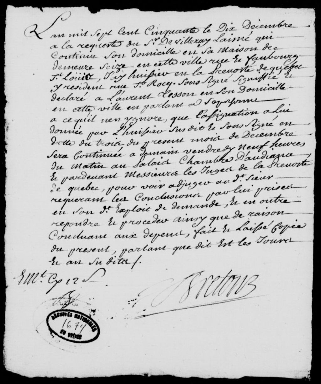 À la requête du sieur de Villeray l'aîné, demeurant rue Saint-Louis à Québec, déclaration à Laurent Tesson, domicilié rue De Meulles, pour lui faire savoir que l'assignation du 3 décembre sera continuée, 10 décembre 1750, Archives nationales à Québec, Fonds Prévôté de Québec, (03Q,TL1,S11,SS2,D1674).
