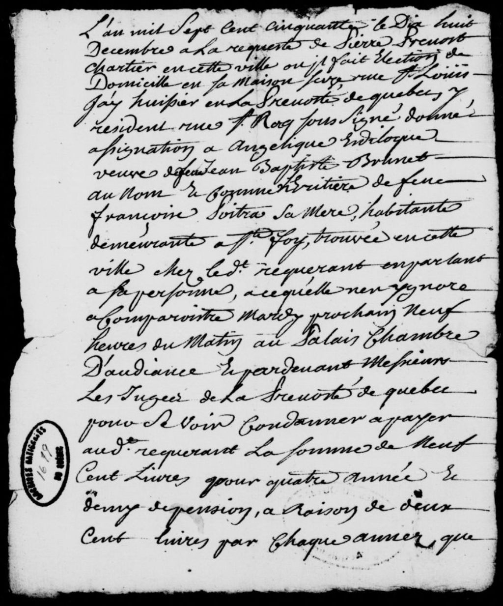 À la requête de Pierre Prévost, charretier de Québec, domicilié rue Saint-Louis, assignation d'Angélique Sédilot (Esdiloque), veuve de Jean-Baptiste Brunet et héritière de la défunte Françoise Poitras, sa mère, habitante demeurant à Sainte-Foy, afin qu'elle paie audit Prévost 900 livres pour quatre années de pension et pour les soins donnés à la disparue, avec dépens
