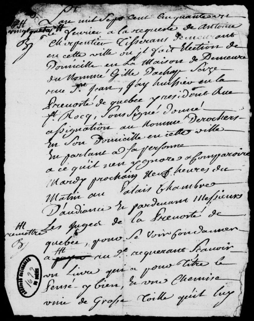 À la requête d'Antoine Charpentier, tisserand, domicilié chez Gilles Achapt (Dachat, Dachapt), rue Saint-Jean à Québec, deux assignations au nommé Desrochers, afin qu'il soit condamné à remettre au requérant un livre intitulé Pensez-y bien et une chemise de grosse toile, avec dépens