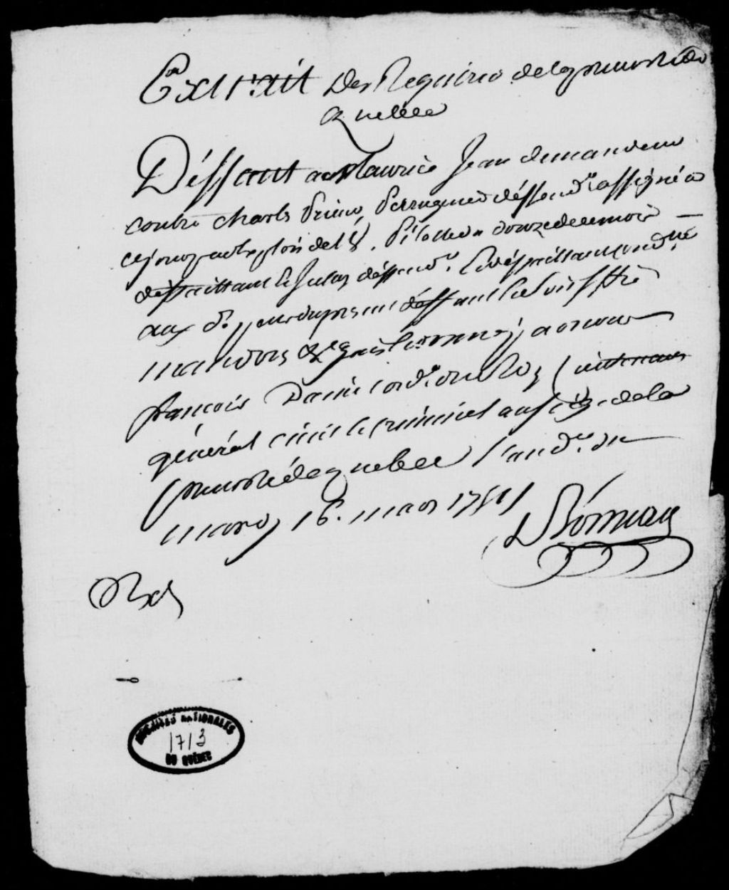 Défaut accordé par François Daine, lieutenant général de la Prévôté de Québec, au sieur Maurice Jean contre Charles Prieur, perruquier de Québec, assigné le 12 mars, défaillant et condamné aux dépens dudit défaut