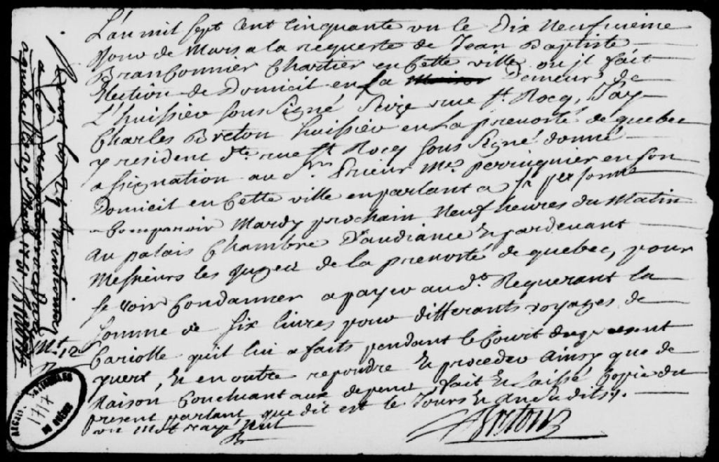 À la requête de Jean-Baptiste Branconnier (Braconnier), charretier de Québec, domicilié chez l'huissier Breton, rue Saint-Roch, assignation donnée au sieur Prieur, maître perruquier de Québec, afin qu'il paie au requérant la somme de 6 livres pour plusieurs voyages en carriole, avec dépens