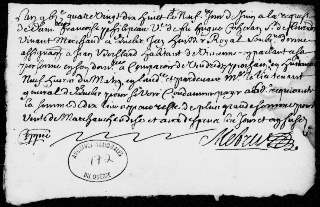 À la requête de Françoise Philippeau, veuve d'Hugues Cochran sieur de Floridor, de son vivant marchand à Québec, assignation de Jean Boilard, de Vincennes, afin qu'il paie le dixième d'une certaine somme pour des marchandises, avec dépens