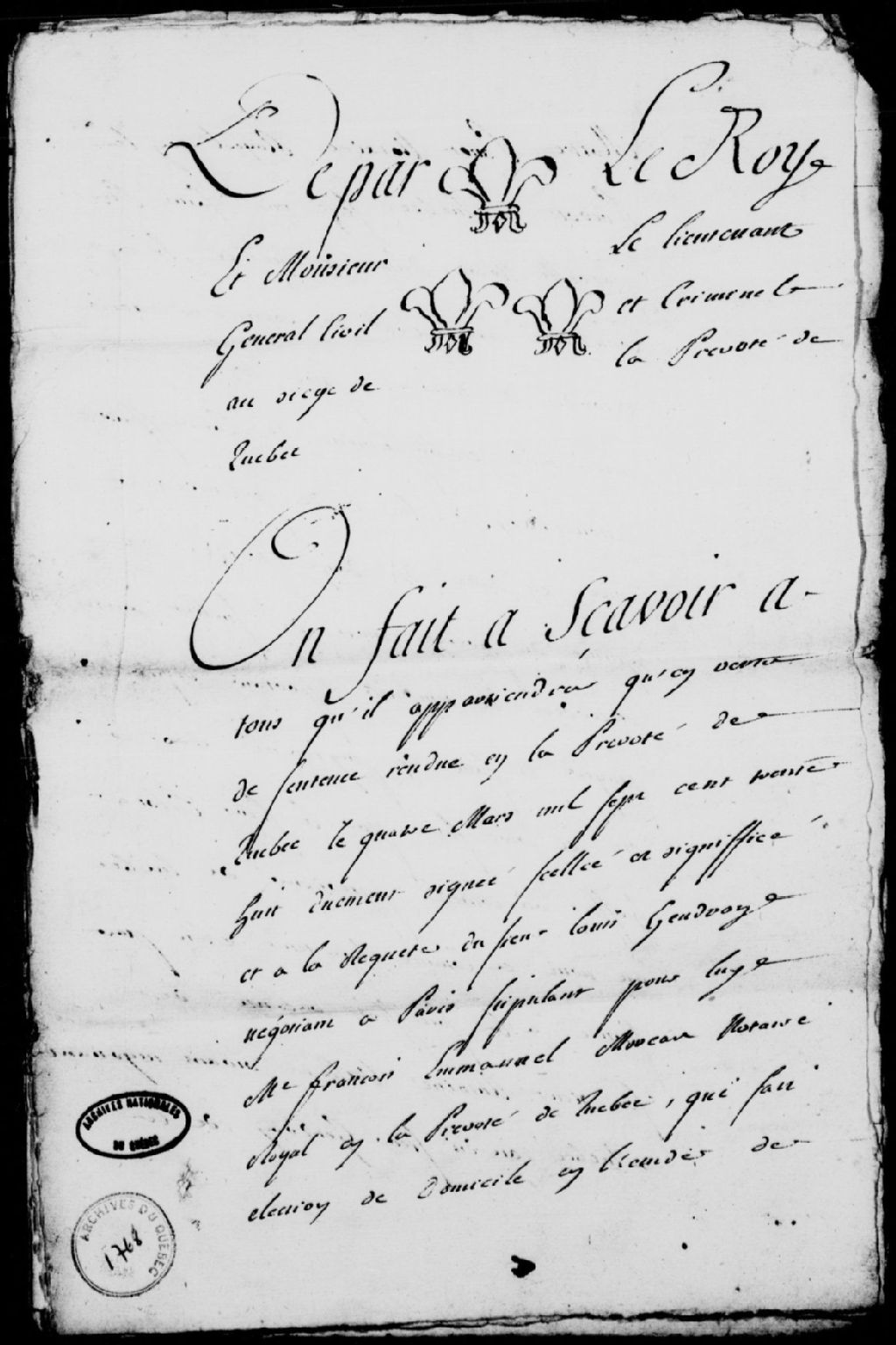 - Ce dossier comprend quatre procès-verbaux d'affichage et de criées d'une maison sise rue Saint-Jean à Québec; une ordonnance pour la remise à huitaine de la vente aux enchères d'une maison; une requête adressée au lieutenant général civil et criminel au siège de la Prévôté de Québec par Louis Gendron, afin que des certificateurs soient nommés pour examiner les criées effectuées pour la vente à l'enchère de la maison saisie sur le sieur Pilotte (Pilote), curateur de la succession Vaillant; une ordonnance signée Daine pour la nomination de certificateurs; un procès-verbal de certification des criées par Christophe-Hilarion Dulaurent et Antoine Saillant, notaires royaux en la Prévôté de Québec; une sentence rendue en la Prévôté de Québec déclarant les criées dûment faites