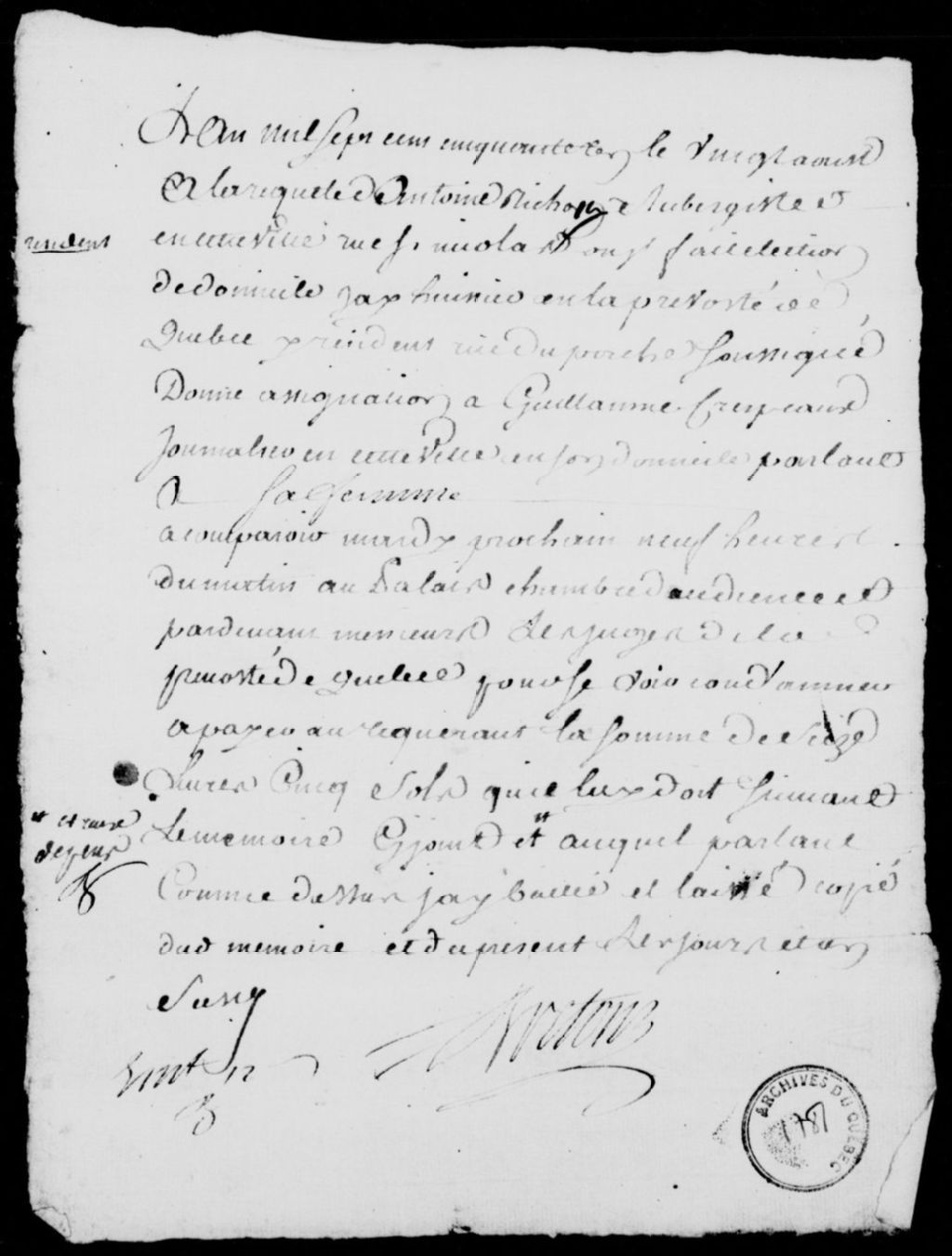 À la requête d'Antoine Richon (Ritchot), aubergiste de Québec, domicilié rue Saint-Nicolas, assignation de Guillaume Crespeaux (Crépeau), journalier de Québec, afin qu'il paie au requérant les 16 livres et 5 sols portés à son mémoire, avec dépens, 20 août 1751, Archives nationales à Québec, Fonds Prévôté de Québec, (03Q,TL1,S11,SS2,D1781).