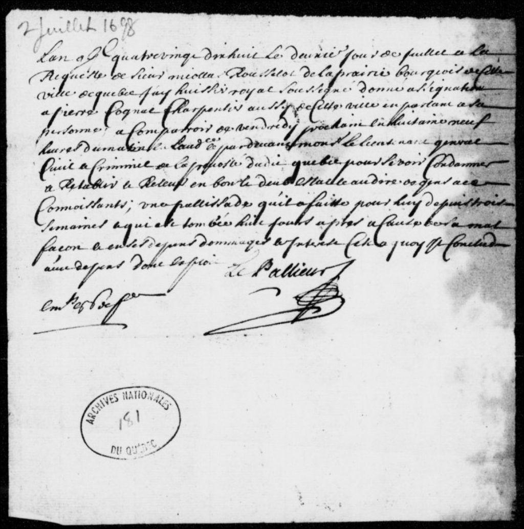 - À la requête de Nicolas Rousselot dit Laprairie, bourgeois de Québec, assignation de Pierre Cognac, charpentier à Québec, afin qu'il rétablisse et relève une palissade qui est tombée et qu'il a construite pour le requérant il y a trois semaines à peine, avec dépens