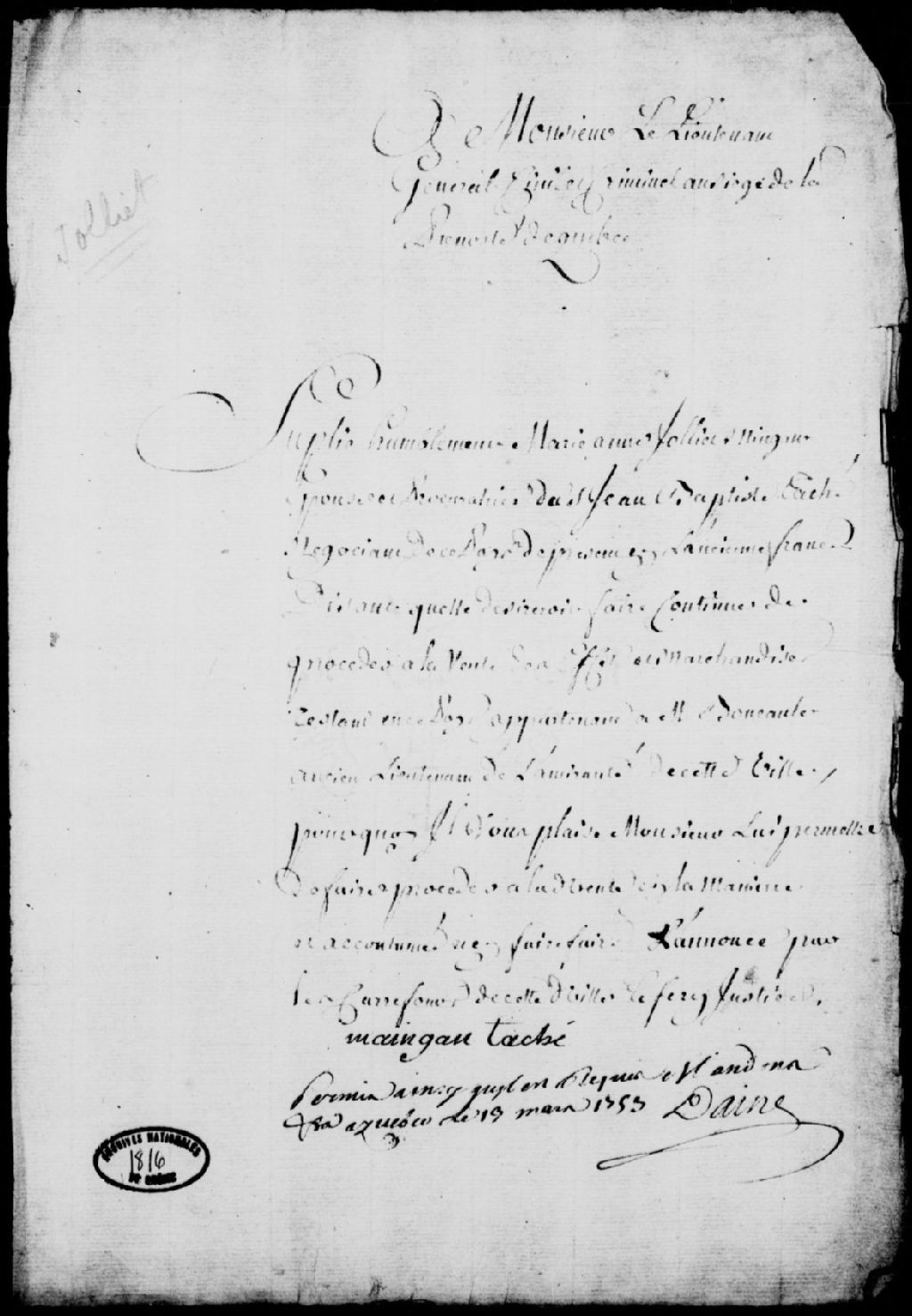 Requête de Marie-Anne Jolliet de Mingan, épouse et procuratrice de Jean-Baptiste Taché, négociant de Québec, présentement en France, afin qu'il soit procédé à la vente par enchère habituelle des effets et marchandises restant en ce pays et appartenant au sieur Boucault, ancien lieutenant de l'Amirauté de Québec, et ordonnance autorisant ladite vente