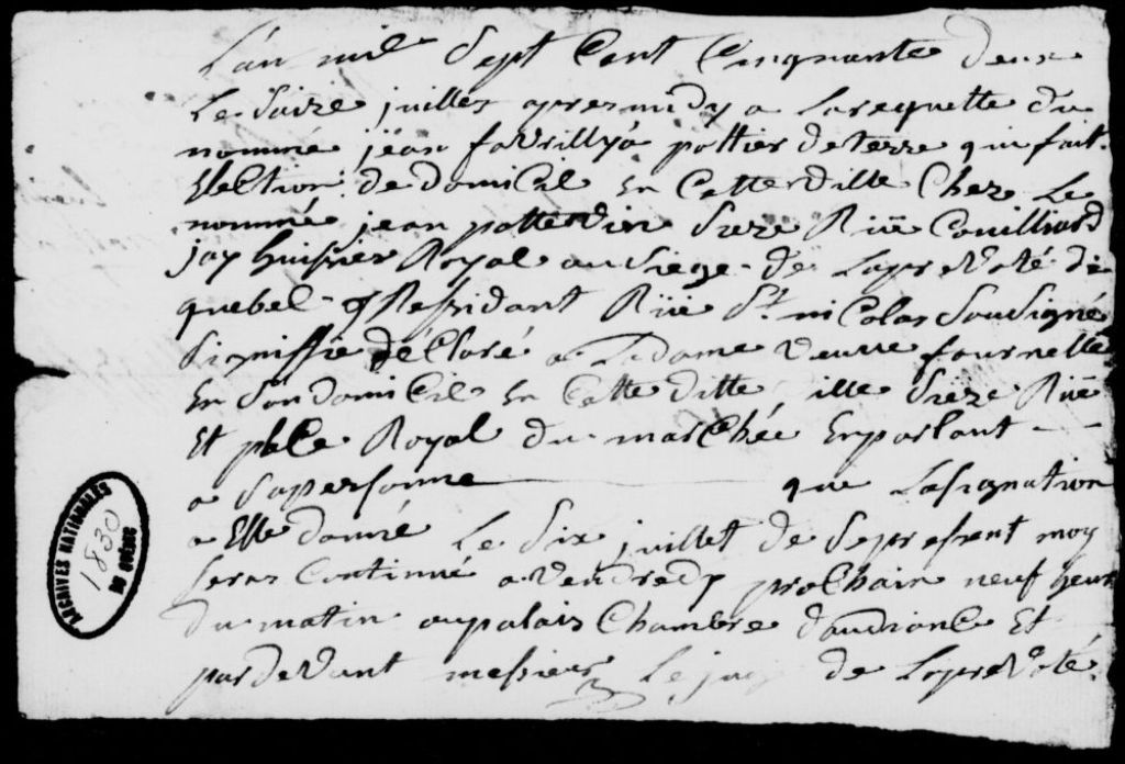 À la requête de Jean Dasylva, potier de terre, domicilié chez Jean Potvin, rue Couillard à Québec, déclaration à la veuve Fournel (Fornel), demeurant sur la Place royale du marché à Québec, pour lui faire savoir que son assignation du 6 juillet sera continuée, 16 juillet 1752, Archives nationales à Québec, Fonds Prévôté de Québec, (03Q,TL1,S11,SS2,D1830).