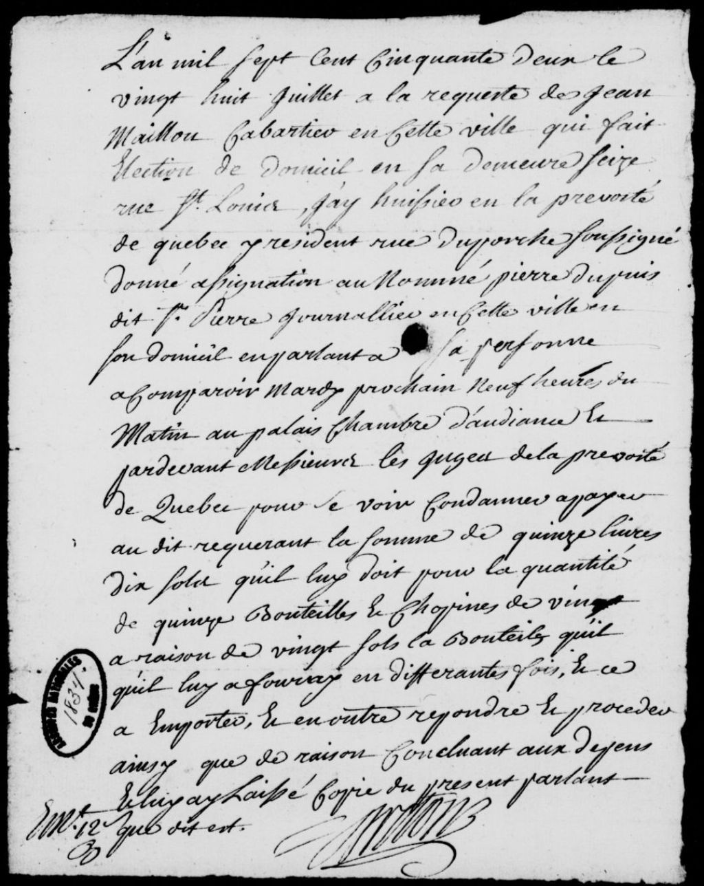 À la requête de Jean Mailloux, cabaretier demeurant à Québec, rue Saint-Louis, assignation de Pierre Dupuis dit Saint-Pierre, journalier de Québec, afin qu'il paie au requérant la somme de 15 livres et 10 sols pour quinze bouteilles et chopines de vin qu'il lui a fournies, 28 juillet 1752, Archives nationales à Québec, Fonds Prévôté de Québec, (03Q,TL1,S11,SS2,D1834).