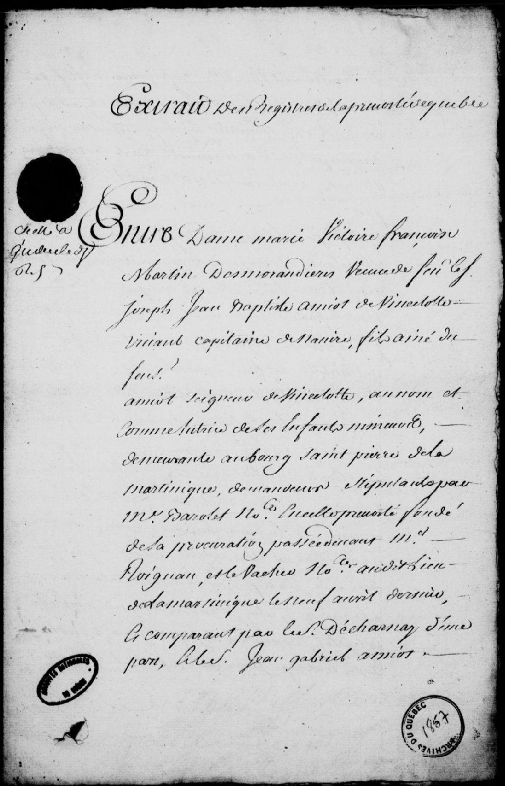 Sentence rendue dans le procès entre Marie-Victoire-Françoise Martin de La Morandière (Desmorandières), veuve de Joseph-Jean-Baptiste Amiot de Vincelotte, de son vivant capitaine de navire et fils aîné du défunt sieur Amiot, seigneur de Vincelotte, au nom et comme tutrice de ses enfants mineurs, domiciliée au bourg Saint-Pierre de la Martinique, stipulant par maître Barolet, notaire royal en la Prévôté de Québec, et le sieur Jean-Gabriel Amiot du Hautmesnil (Hautmesny) de Vincelotte, coseigneur du fief de Vincelotte, en son nom et en celui des cohéritiers, le tribunal ordonnant qu'il sera procédé au partage dudit fief par le sieur Panet, et exploit de signification de ladite sentence au coseigneur dudit fief, 29 janvier 1754 - 7 février 1754, Archives nationales à Québec, Fonds Prévôté de Québec, (03Q,TL1,S11,SS2,D1857).