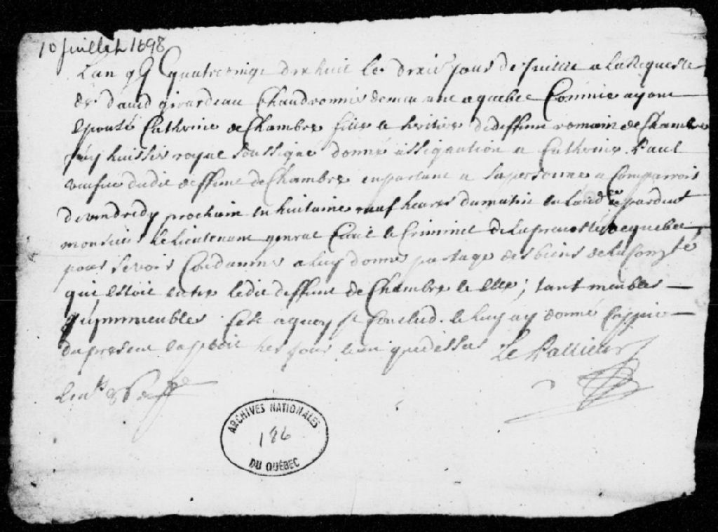À la requête de David Girardeau (Giraudeau), chaudronnier à Québec et époux de Catherine de Chambre (Dechambre), fille héritière de feu Romain de Chambre (Dechambre), assignation donnée à Catherine Paul, veuve dudit feu Romain de Chambre, afin qu'elle partage sa communauté de biens, avec dépens, 10 juillet 1698, Archives nationales à Québec, Fonds Prévôté de Québec, (03Q,TL1,S11,SS2,D186).