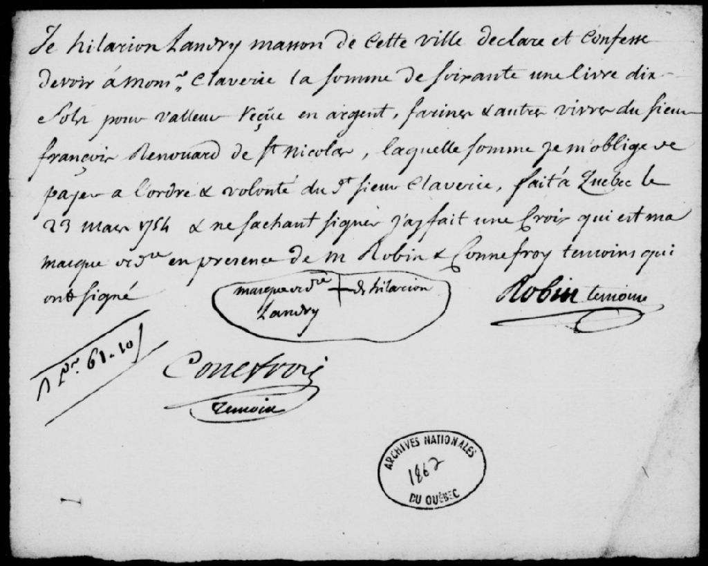 Billet d'Hilarion Landry, maçon de Québec, en faveur du sieur Claverie, au montant de 61 livres et 10 sols, pour valeur reçue en argent, farine et autres vivres du sieur François Renouard, habitant de Saint-Nicolas, signification dudit billet au sieur Landry, à la requête de François Renouard, ayant l'ordre du sieur Claverie, et assignation à lui donnée de comparaître, 23 mars 1754 - 6 février 1756, Archives nationales à Québec, Fonds Prévôté de Québec, (03Q,TL1,S11,SS2,D1862).