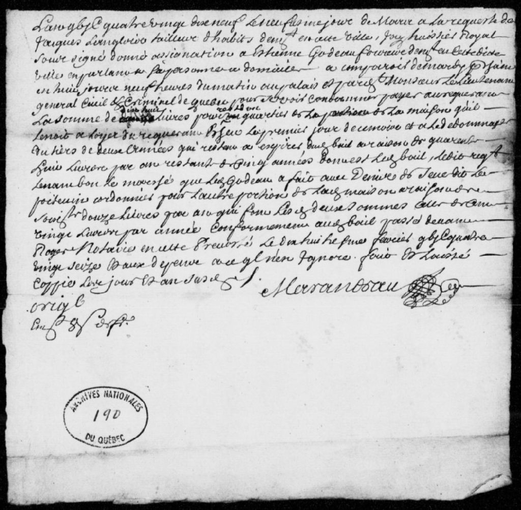 À la requête de Jacques Langlois, tailleur d'habits à Québec, assignation d'Étienne Godeau, fourreur à Québec, afin qu'il paie ce qu'il doit pour le loyer d'une maison et les arrérages, compte tenu d'un marché conclu avec Denis Desèvre dit Poitevin, cordonnier, devant le notaire Roger, le 18 février 1696, avec dépens, 9 mars 1699, Archives nationales à Québec, Fonds Prévôté de Québec, (03Q,TL1,S11,SS2,D190).