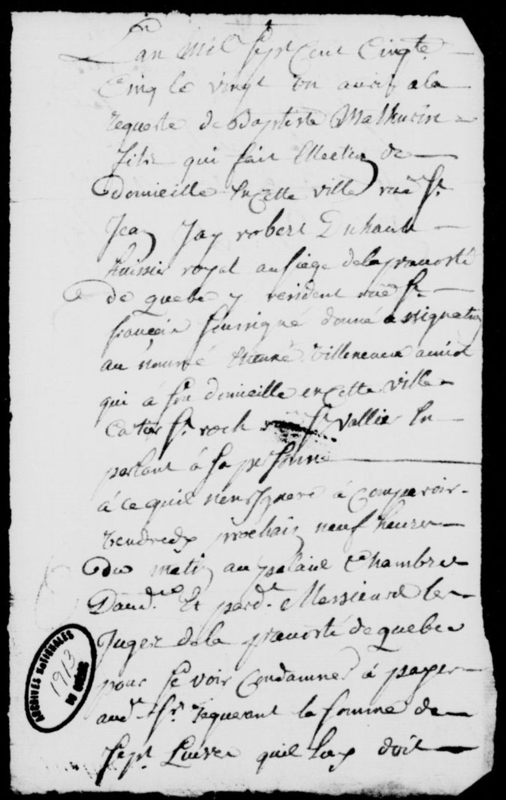À la requête de Jean-Baptiste Mathurin fils, domicilié rue Saint-Jean à Québec, assignation d'Étienne Amiot dit Villeneuve, demeurant rue Saint-Vallier, dans le quartier Saint-Roch à Québec, afin qu'il soit condamné à payer au requérant les 7 livres qu'il lui doit, avec dépens, 21 avril 1755, Archives nationales à Québec, Fonds Prévôté de Québec, (03Q,TL1,S11,SS2,D1913).