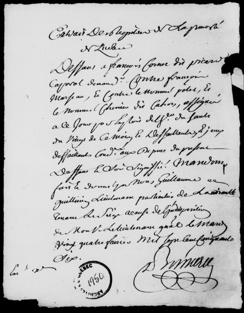 Défaut accordé par Guillaume Guillimin, lieutenant particulier au siège de l'Amirauté de Québec, à François Cornet dit Picard, caporal, contre François Marseau (Marceau), le nommé Pilet et le nommé Chenier dit Cahors, assignés, défaillants et condamnés aux dépens