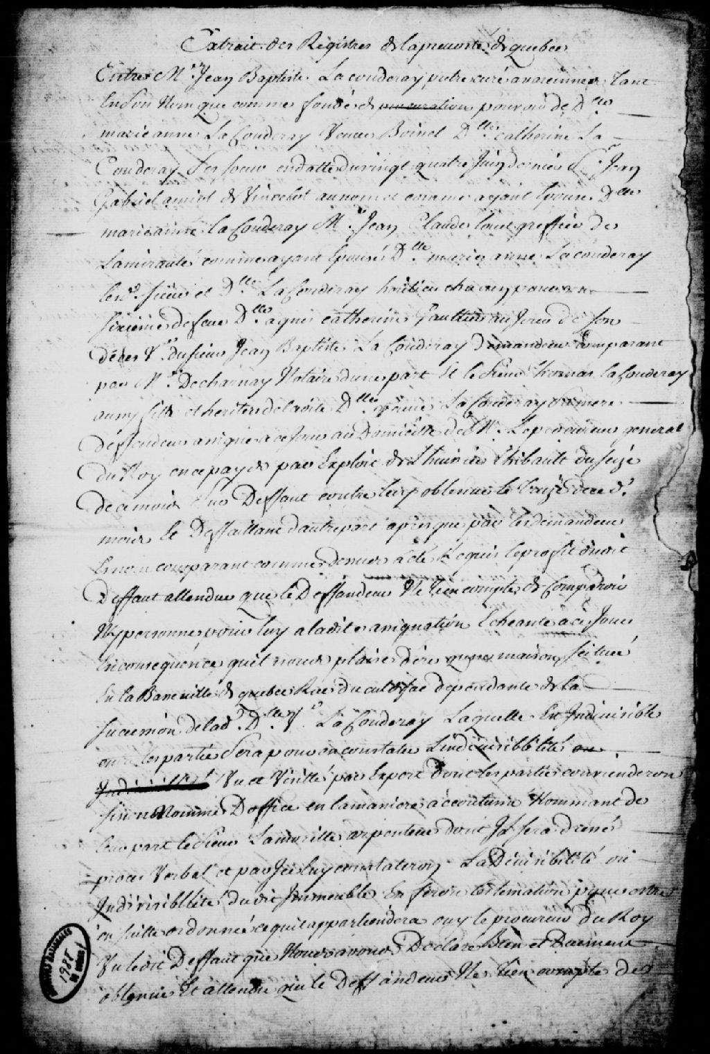 Sentence rendue dans la cause entre les héritiers de la défunte Agnès-Catherine Gaultier (Gauthier), veuve de Jean-Baptiste Lacoudray, comparant par maître Decharnay, et Thomas Lacoudray, défendeur, aussi fils et héritier de ladite Gaultier, à l'effet que les sieurs de LaMorille et Lapalme, après expertise et estimation, pourront dire si la maison dont il est question, sise rue du Cul-de-Sac à Québec, est divisible ou non, requête de Jean-Baptiste Lacoudray, prêtre et curé de Varennes, et consorts, pour faire assigner lesdits experts et leur faire prêter serment avant qu'ils dressent leur procès-verbal, et ordonnance du sieur Guillimin autorisant l'assignation des experts