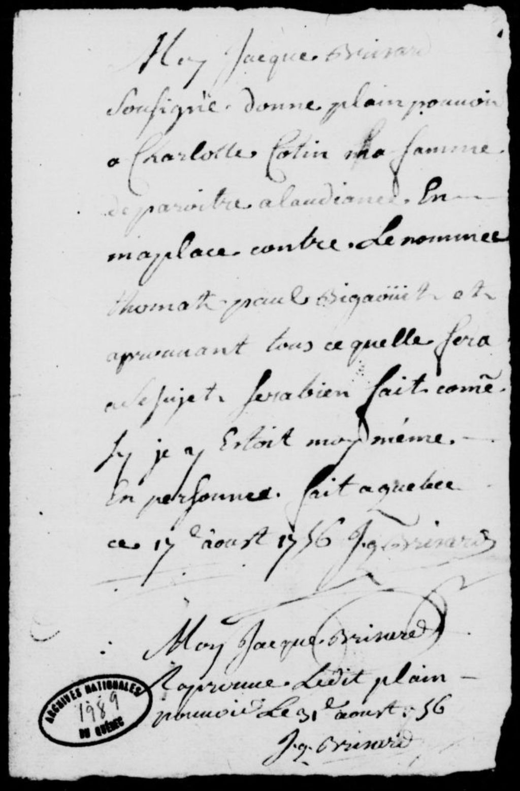 Documents concernant le procès entre Jacques Brisard, aubergiste de Québec, domicilié rue Saint-Vallier, comparant par Charlotte Cotin, sa femme, et Thomas-Paul Bigaouet, journalier de Québec, comparant par l'huissier Jailliard, le tribunal ordonnant que les parties comparaissent en personne devant François Daine, pour le règlement d'un mémoire au montant de 5 livres et 12 sols, 22 juillet 1756 - 31 août 1756, Archives nationales à Québec, Fonds Prévôté de Québec, (03Q,TL1,S11,SS2,D1989).