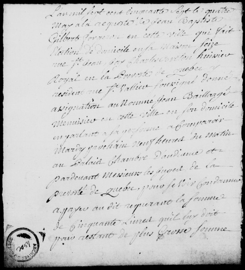 À la requête de Jean-Baptiste Gilbert, forgeron de Québec, domicilié rue Saint-Jean, assignation de Jean Baillargé, menuisier de Québec, afin qu'il paie 50 livres audit Gilbert, pour le reste d'une somme qu'il devait pour du travail que le requérant lui a fourni, avec dépens, 4 mai 1757, Archives nationales à Québec, Fonds Prévôté de Québec, (03Q,TL1,S11,SS2,D2059).