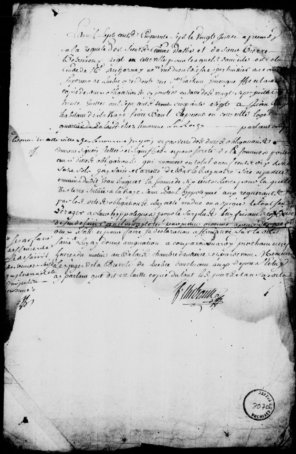 À la requête des sieurs Étienne Dassier (Dacier) et Pierre Pétrimoulx, négociants de Québec, domiciliés en l'étude de maître Decharnay, rue du Cul-de-Sac, signification de deux obligations à Jean Ringuet, habitant de la Baie-Saint-Paul, procès-verbal de saisie et arrêt sur ledit Ringuet, et assignation dudit Ringuet à comparaître