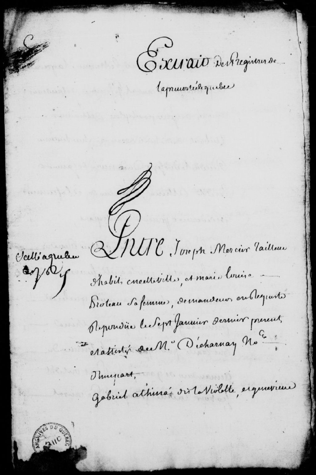 - Sentence rendue dans le procès entre Joseph Mercier, tailleur d'habits de Québec, époux de Marie-Louise Proteau, assisté de maître Decharnay, demandeur, et Gabriel Athina (Attina) dit Laviolette, époux de Geneviève Beaufort, et le nommé Lagrenade et Françoise Beauval, sa femme, défendeurs, les femmes Laviolette et Lagrenade, après la sentence du 17 janvier, étant accusées d'avoir soutenu que la femme du sieur Mercier était une prostituée, et le tribunal condamnant les défendeurs et leurs femmes, après la déposition des témoins, à faire réparation d'honneur et à payer l'amende et les frais, et exploit de signification de ladite sentence