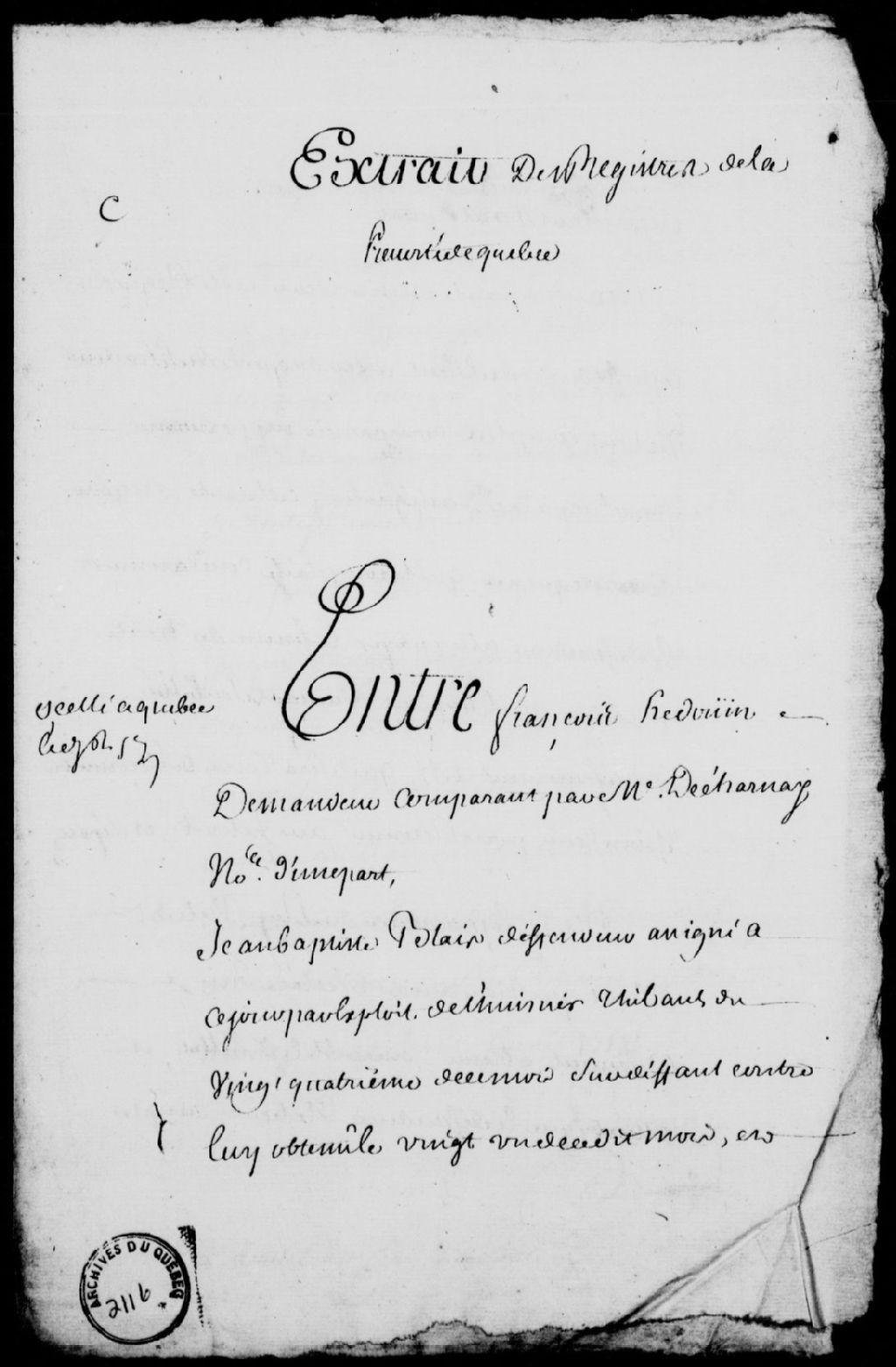 Sentence rendue par-devant Guillaume Guillimin, lieutenant de l'Amirauté de Québec, dans le procès entre François Hédouin, comparant par maître Decharnay, demandeur, et Jean-Baptiste Blais, défendeur assigné, le demandeur requiérant le profit d'un défaut et exigeant que le défendeur soit condamné à lui payer un billet de 36 livres, daté de 1757, qui devra être reconnu, et le tribunal condamnant le défendeur à payer au demandeur ledit billet, avec les intérêts qui courent et les dépens liquidés à 7 livres et 10 sols, les présentes comprises, et exploit de signification de ladite sentence au sieur Blais, domicilié rue du Cul-de-Sac à Québec