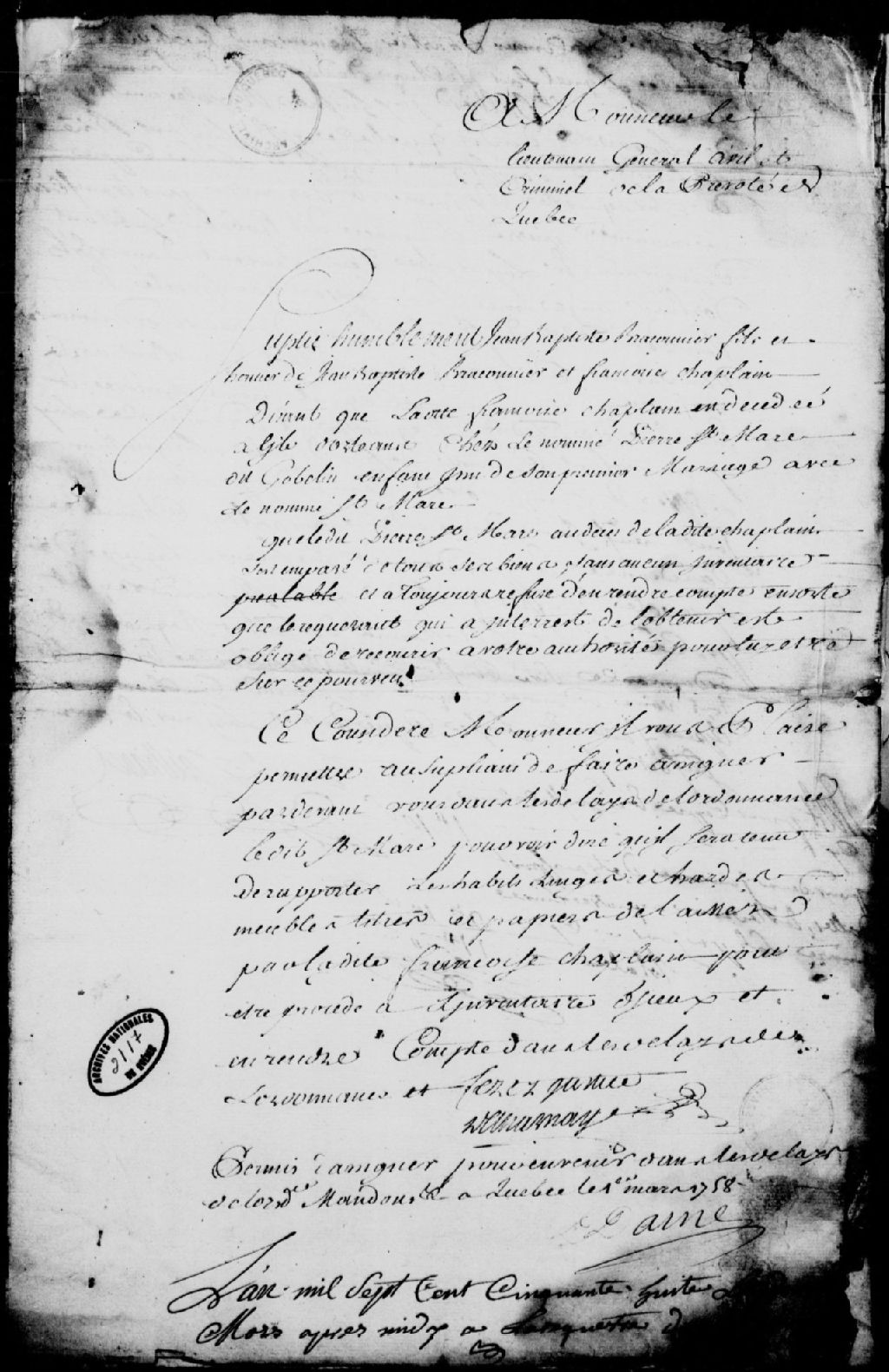 Requête de Jean-Baptiste Braconnier (Branconnier), charretier de Québec, domicilié rue Saint-Vallier, fils et héritier des défunts Jean-Baptiste Braconnier et Françoise Chaplain (Chapelain), pour faire assigner Pierre Saint-Mars dit Gobelin, habitant de Saint-Laurent sur l'Île d'Orléans, enfant du premier mariage de Françoise Chaplain avec le nommé Saint-Mars, afin qu'il rende compte des biens de ladite Chaplain, ordonnance pour faire assigner ledit Saint-Mars, et exploit de signification de la requête et de l'ordonnance à Pierre Saint-Mars dit Gobelin, lequel est assigné à comparaître, et d'une procuration de Jean-Baptiste Braconnier à maître Decharnay, 1er mars 1758 - 2 mars 1758, Archives nationales à Québec, Fonds Prévôté de Québec, (03Q,TL1,S11,SS2,D2117).