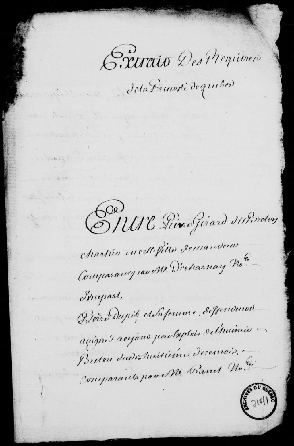 Sentence rendue dans le procès entre Pierre Girard dit Breton, charretier de Québec, comparant par maître Decharnay, et Pierre Dupil et sa femme, comparant par maître Panet, au sujet de pieux enlevés et jetés dans la rue, ou plutôt enlevés par une Acadienne qui voulut passer à travers la clôture du jardin, le tribunal ordonnant aux parties de faire preuve par des témoins, qui devront être assignés dans le délai de l'ordonnance (2 copies), 25 avril 1758, Archives nationales à Québec, Fonds Prévôté de Québec, (03Q,TL1,S11,SS2,D2141).