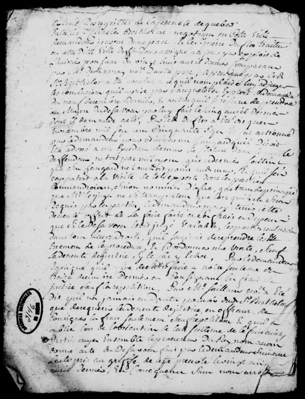 Sentence rendue dans le procès entre Charles Berthelot, négociant, et Pierre Duflos (Duflot, Flot), traiteur de Québec, à l'effet que des experts feront la visite des lieux dont il est question pour constater si le hangar du défendeur touche au mur du demandeur, et dresseront leur procès-verbal, requête du sieur Berthelot pour faire assigner les experts Janson dit Lapalme et Lemaître de LaMorille, et ledit Pierre Duflos, et exploit de signification de la requête et de la sentence audit Pierre Duflos, lequel est assigné à comparaître, 2 mai 1758 - 11 mai 1758, Archives nationales à Québec, Fonds Prévôté de Québec, (03Q,TL1,S11,SS2,D2146).