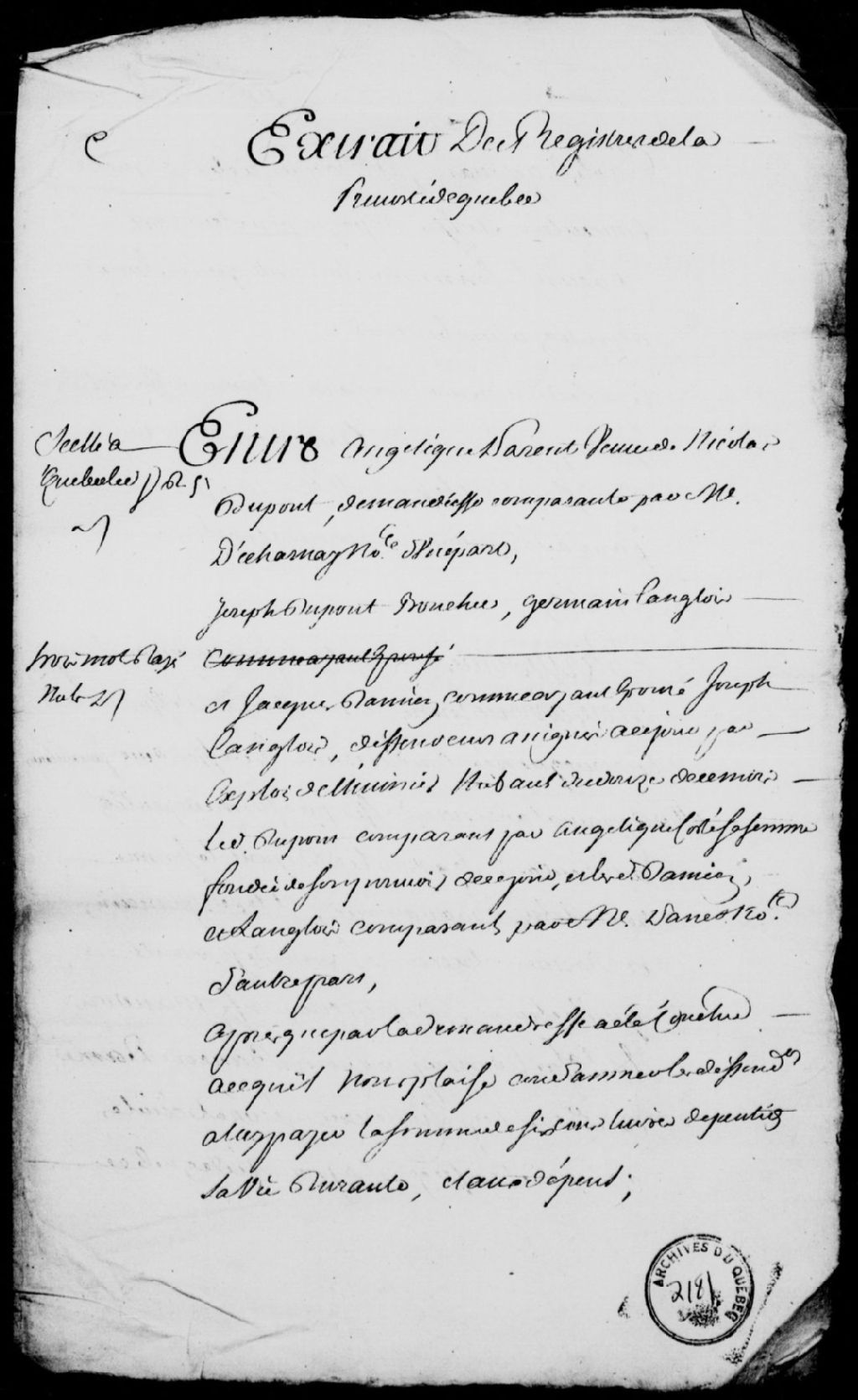 Sentence rendue dans la cause entre Angélique Parent, veuve de Nicolas Dupont, et Joseph Dupont, Germain Langlois et Jacques Damien, lesquels sont condamnés à payer à ladite veuve une pension alimentaire, et exploit de signification de ladite sentence à Jacques Damien, Germain Langlois et Joseph Dupont, 16 août 1758 - 26 août 1758, Archives nationales à Québec, Fonds Prévôté de Québec, (03Q,TL1,S11,SS2,D2181).