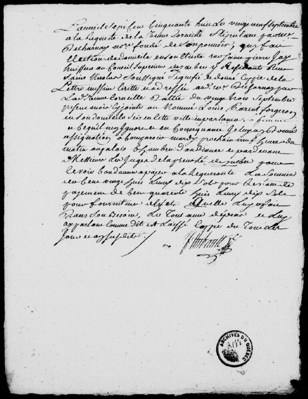 Deux pièces concernant le procès entre la veuve Corneille, stipulant par maître Decharnay, fondé de son pouvoir, chez qui elle a élu domicile, rue Saint-Pierre, et Louis Parent, forgeron de Québec, défendeur, au sujet de la somme de 128 livres et 10 sols que le défendeur doit à ladite veuve Corneille, pour divers articles qu'elle lui a fournis, 29 septembre 1758 - 12 octobre 1758, Archives nationales à Québec, Fonds Prévôté de Québec, (03Q,TL1,S11,SS2,D2188).