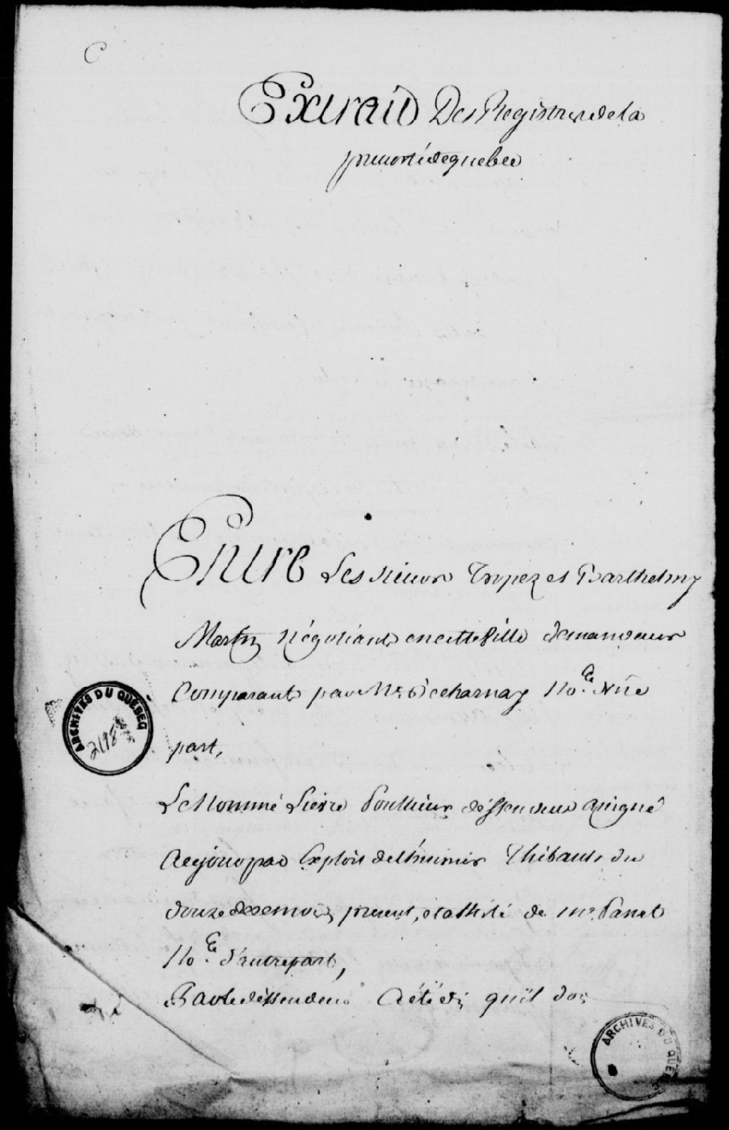 - Pièces concernant un procès entre les sieurs Tropez et Barthélemi Martin, négociants de Québec, demandeurs, comparant par maître Decharnay, et le sieur Lièvre (Lelièvre), poulieur de Québec, défendeur, assisté de maître Panet, au sujet de la somme de 350 livres que le défendeur doit aux demandeurs pour des barriques de vin rouge de Bordeaux
