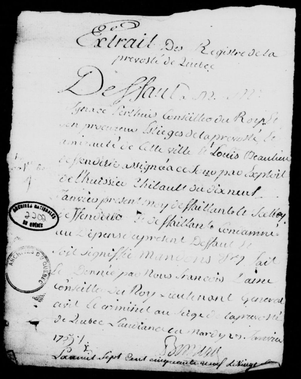 Pièces concernant le procès entre Ignace Perthuis, conseiller du Roi et son procureur au siège de la Prévôté et Amirauté de Québec, au nom et comme ayant épousé Madeleine Hiché, et Gaspard Hiché, officier du détachement de la marine, tous deux héritiers de feu Henri Hiché, de son vivant conseiller au Conseil supérieur de Québec, demandeurs, et la veuve de Louis Beaulieu, domiciliée dans le quartier Saint-Roch, défenderesse, au sujet des arrérages de rente que la défenderesse doit auxdits sieurs Gaspard Hiché et Ignace Perthuis, 19 janvier 1759 - 26 janvier 1759, Archives nationales à Québec, Fonds Prévôté de Québec, (03Q,TL1,S11,SS2,D2202).