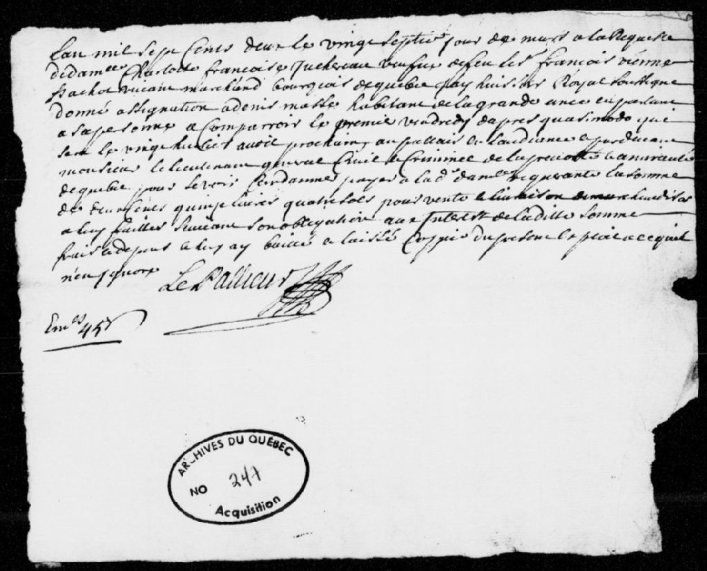 À la requête de Charlotte-Françoise Juchereau, veuve de François Viennay-Pachot, de son vivant marchand bourgeois à Québec, assignation de Denis Masse, habitant de la Grande-Anse, afin qu'il paie 125 livres et 4 sols pour des marchandises vendues et livrées, avec intérêts, frais et dépens, 27 mars 1702, Archives nationales à Québec, Fonds Prévôté de Québec, (03Q,TL1,S11,SS2,D247).