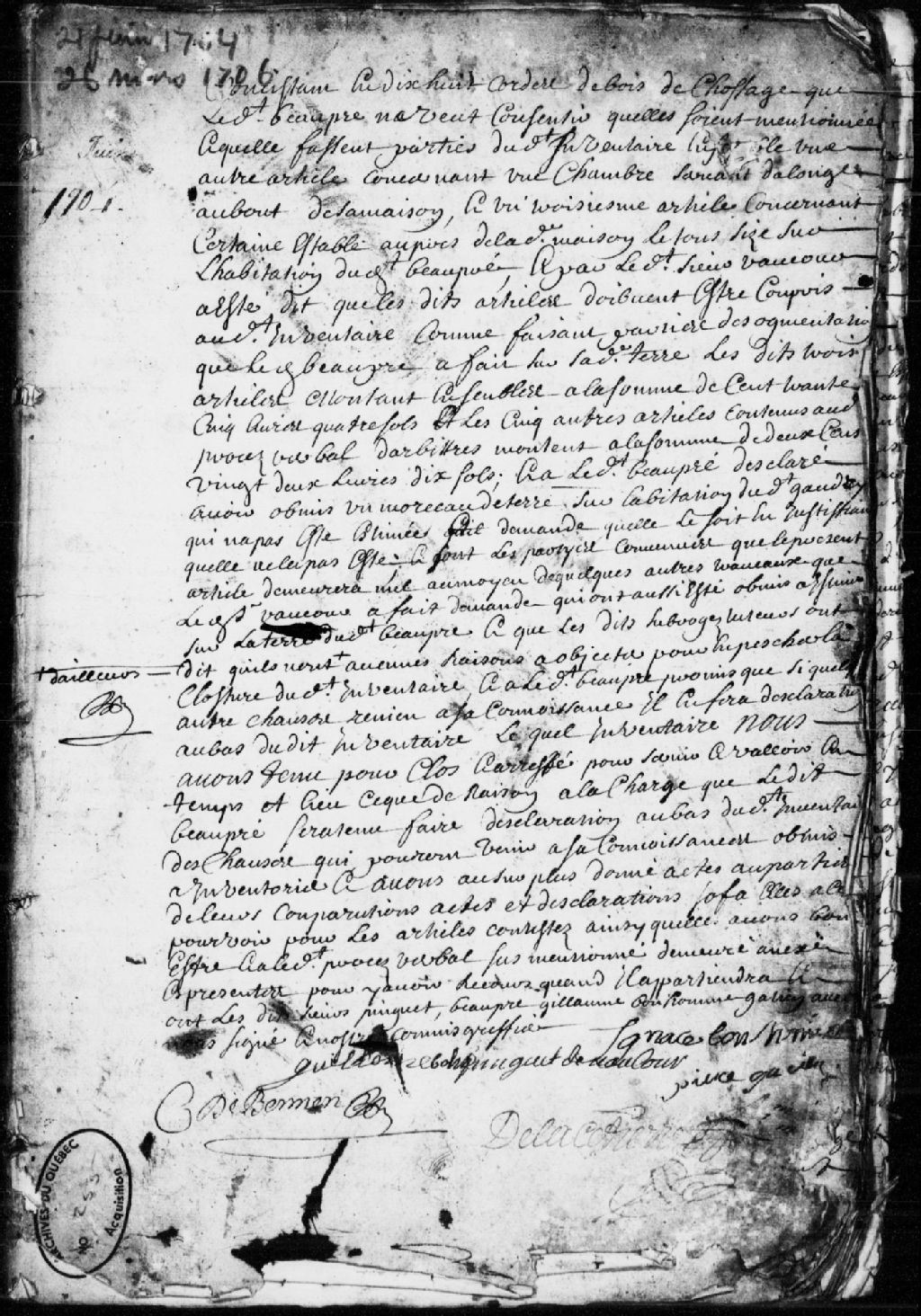 - Ce dossier comprend un procès-verbal d'inventaire; une ordonnance pour la confirmation d'Eustache Fortin à son titre de tuteur des enfants mineurs issus du mariage entre feu Jean Lepicard (Picard), de son vivant marchand de Québec, et Marie-Anne Fortin; une ordonnance pour la confirmation de Mathieu Lagrange à son titre de tuteur des enfants mineurs issus du mariage entre feu René Parent, de son vivant habitant de Beauport, et Marie-Madeleine Courault; une ordonnance pour la confirmation de Bertrand Bélanger à son titre de tuteur des enfants mineurs issus de son mariage avec feue Marie Gignard; une ordonnance pour la confirmation de René Bouchaut à son titre de tuteur des enfants mineurs issus du mariage entre feu Charles Trépanier et Marguerite Jacquereau, épouse en secondes noces dudit Bouchaut; une ordonnance confirmant Jacques Barbel comme syndic des créanciers de la succession de feu Charles Trépanier; une ordonnance pour la clôture de l'inventaire des biens de feu René Parent; une ordonnance confirmant Marie Jean comme tutrice des enfants mineurs issus de son mariage avec feu Pierre Bourget; une ordonnance pour la clôture de l'inventaire des biens de feu François Francourt et de Marie-Madeleine Saint-Jean; une ordonnance entérinant les lettres d'émancipation de Louis et François Fiset; une ordonnance confirmant le sieur comme tuteur de Thérèse Chabot; une ordonnance confirmant Catherine Mignault comme tutrice des enfants mineurs issus de son mariage avec feu Pierre Lemoine (Lemoyne); une ordonnance pour la location d'une maison appartenant à Charles Hazeur, mineur, à Louis Chambalon (Chamballon), jusqu'à la majorité dudit Hazeur; une ordonnance confirmant François de Galifet comme tuteur des enfants mineurs issus de son mariage avec feue Catherine Aubert; une ordonnance concernant le remboursement de certaines sommes à Augustin Legardeur pour la tutelle de Joseph Charet; une ordonnance donnant acte à Étienne Mirambeau et Jacques Barbel, procureur d'Eustache Fournier, de leur comparution; une ordonnance confirmant Noël Levasseur comme tuteur des enfants issus de son mariage avec Marguerite Guay; une ordonnance confimant la clôture de l'inventaire des biens issus des deux mariages de Claude Pauperet; une ordonnance confirmant Louis Loisel comme tuteur des enfants mineurs issus de son mariage avec feue Marie-Madeleine Martel; une ordonnance confirmant la clôture de l'inventaire des biens entre feu François Constantin et Anne Laizeau; une ordonnance confirmant Marguerite Boutin comme tutrice des enfants mineurs issus de son mariage avec feu André Couteron (Coutron); une ordonnance pour la clôture de l'inventaire des biens des défunts Michel Chabot dit Lamarre et Marie-Madeleine Legardeur; une confirmation du sieur Duroy comme curateur des deniers de la succession de Marguerite Bélanger, veuve Levasseur; un acte de délibération au sieur Desmoliers (Demolier); une ordonnance confirmant Pierre Vallée comme tuteur des enfants mineurs de Marie-Madeleine Courault; une ordonnance pour la clôture de l'inventaire des biens de feu Pierre Bourget et de Marie Jean; une ordonnance confirmant Élisabeth Laguéripière comme tutrice des enfants mineurs issus de son mariage avec Jean Rainville; une ordonnance confirmant Mathurin Meunier comme tuteur de ses enfants mineurs issus de son mariage avec Marie-Madeleine Meneux; une ordonnance confirmant la réception d'une maison par Guillaume Gaillard en paiement des sommes dépensées en tutelle; une ordonnance pour la clôture de l'inventaire des biens de feu Jean Rainville; une ordonnance confirmant Vital Joly comme tuteur; une ordonnance confirmant Jean Simon comme tuteur des enfants mineurs issus du mariage entre René Arnaud et Marie Vignier; une ordonnance pour la clôture de l'inventaire des biens de feu René Paquet (Pasquier) et d'Hélène Lemieux; le procès-verbal de l'assermentation des sieurs Émard (Haimard), Janson et Marchand, avant de procéder à l'estimation d'une maison; une ordonnance pour la criée d'une maison à louer appartenant aux enfants mineurs de feu Eustache Lambert et de Marie Vanneck; une ordonnance pour la communication des pièces dans l'instance opposant Jean Simon et Anne Renaud; une ordonnance pour la clôture de l'inventaire des biens de feue Marie-Madeleine Meneux et de Mathurin Meunier; une ordonnance confirmant Sébastien Liénard comme tuteur des enfants mineurs de feu Denis Mallet et Geneviève Liénard; une ordonnance confirmant Jean-Baptiste Halay comme tuteur des enfants mineurs de feue Barbe Halay et de Jean Carrier; une ordonnance confirmant Louis Lemieux comme tuteur des enfants issus de son mariage avec feue Marie-Anne Carrier; une ordonnance confirmant Jacques Turgeon comme tuteur des enfants mineurs issus du mariage entre les défunts Pierre Turgeon et Marie-Anne Carrier, femme en secondes noces de Louis Lemieux; une ordonnance confirmant Jean de Mosny comme tuteur des enfants mineurs issus de son mariage avec Julienne Bisson; une ordonnance pour la clôture de l'inventaire des biens de feu André Couteron (Coutron) et de Marguerite Boutin, épouse en secondes noces de Jacques Guénet; un acte d'assermentation de Jean-Baptiste Halay comme tuteur des enfants mineurs de feue Barbe Halay et de Jean Carrier; une ordonnance confirmant Jacques Pinguet, sieur de Vaucours (Vaucourt), comme tuteur des enfants mineurs issus de son mariage avec feue Marie-Anne Morin; une ordonnance pour la clôture de l'inventaire des biens des défunts Denis Mallet et Geneviève Liénard; une ordonnance pour la clôture de l'inventaire des biens de feue Barbe Halay et de Jean Carrier; une ordonnance pour la nomination d'arbitres pour procéder à une nouvelle estimation des biens de feue Marie-Anne Carrier; un acte d'assermentation des arbitres nommés pour faire l'estimation des biens de feue Marie-Anne Carrier; une ordonnance pour la clôture de l'inventaire des biens de feue Marie-Ann