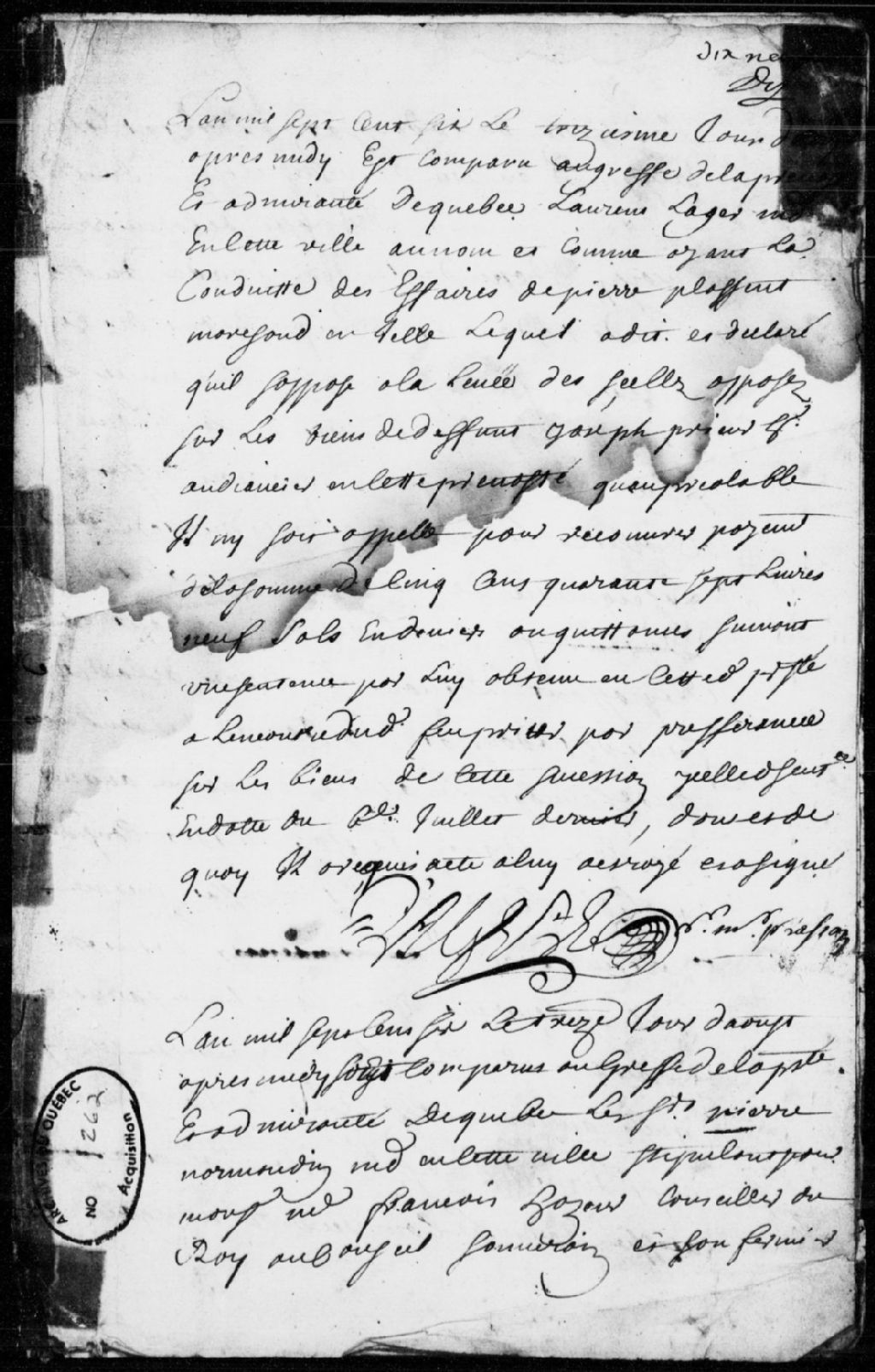 Cette pièce comprend une déclaration de Pierre Normandin, marchand de Québec, stipulant pour François Hazeur, conseiller du Roi au Conseil souverain et son fermier aux traites de Tadoussac, et Vital Caron, aussi marchand, à l'effet que depuis la mort de Louis Jolliet, François Bissot, Charles et Louis Jolliet, propriétaires de la seigneurie des îles de Mingan, ont fait préjudice à la compagnie de Tadoussac; une déclaration de Philippe Peiré, marchand bourgeois de Québec, au nom et comme faisant pour Pierre Peiré, son frère, s'opposant à la délivrance des effets d'une saisie effectuée sur un chariot appartenant au sieur Courtemanche, pour recouvrer le paiement de la somme de 654 livres portée par un billet signé par ledit Courtemanche et par Marie-Charlotte Charet; une déclaration de Jeanne-Angélique Gobeil, femme de Louis Prat, boulanger, s'opposant à la délivrance des objets saisis dans un bateau normand appartenant au sieur Courtemanche, pour recouvrer paiement de la somme de 590 livres et 5 sols portée par un compte; une déclaration d'Alphonse de Tonty, écuyer, capitaine d'une compagnie des troupes du Détachement de la marine, protestant de tous les dommages, intérêts et frais relatifs au voyage fait en canot de Montréal à Québec, suivant la requête de Françoise Viennay-Pachot, veuve de feu Alexandre Berthier, de son vivant officier dans les troupes; une déclaration de François Aubert, écuyer, conseiller du Roi au Conseil souverain, concernant la déposition de plusieurs lettres et missives au greffe de la Prévôté pour être utilisées dans le procès contre le sieur Denis; une déclaration de François Garnier, habitant de la seigneurie de Neuville, concernant la production de nombreuses pièces au greffe de la Prévôté de Québec; une déclaration de Jean-Baptiste Méchin, huissier audiencier de la Prévôté de Québec, au nom et comme procureur de Jean Baugis, habitant de Beauport, concernant la production de pièces au greffe de la Prévôté; des déclarations d'opposition à la levée des scellés apposés sur les biens de feu Joseph Prieur, huissier audiancier de la Prévôté de Québec, par plusieurs de ses créanciers, dont Laurent Lagère, marchand de Québec, au nom et comme ayant la conduite des affaires de Pierre Plassan, marchand de Québec, Jacques Pinguet, bourgeois de Québec, faisant tant pour lui que pour Nicolas Pinguet, son frère, Louis Chambalon (Chamballon), notaire royal en la Prévôté de Québec, Thomas Doyon, au nom et comme tuteur des enfants mineurs de feu Charles Trépanier, vivant boulanger de Québec, et de Marguerite Jacquereau, Charlotte-Françoise Juchereau, femme de François Viennay-Pachot, capitaine d'une compagnie des troupes du Détachement de la marine, Louis Gauthier, sieur de Comporté, faisant pour sa soeur Angélique Gauthier, femme de Denis Riverin, conseiller au Conseil souverain, Marie-Anne Gauthier de Comporté, femme de feu Alexandre Peuvret, de son vivant conseiller-secrétaire du Roi et greffier en chef du Conseil souverain, Pierre Duroy, marchand boucher de Québec, Florent de La Cetière (Lacetière), notaire royal en la Prévôté de Québec, au nom et comme ayant la conduite des affaires de la succession de feu Jean Jung, de son vivant marchand de Québec, Samuel Lecomte, sieur de La Vimaudière, chirurgien de la seigneurie de Beaupré, et Simon Soupiran, chirurgien de Québec